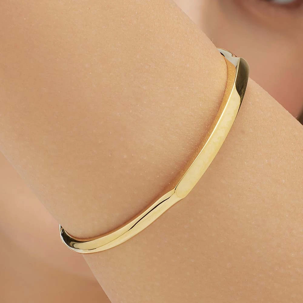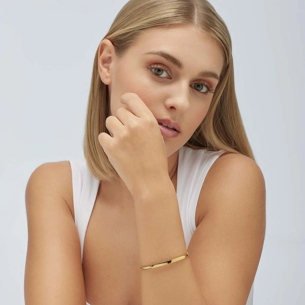 Náramek z chirurgické oceli pro ženy. Náramek má leštěný povrch pozlacený technologií PVD. Zlatý povrch náramku zvýrazňují prvotřídní bílé krystaly. Průměr náramku 60mm.