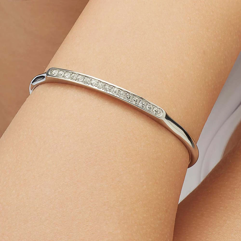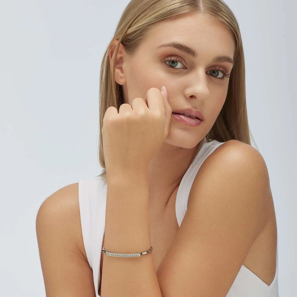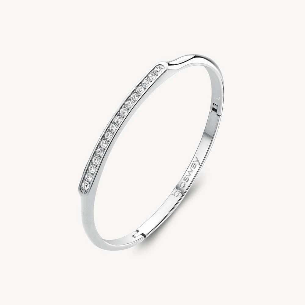 Dámský pevný náramek z chirurgické oceli s leštěným povrchem. Náramek je zvýrazněný zářivými krystaly. Vnitřní průměr náramku 60mm.