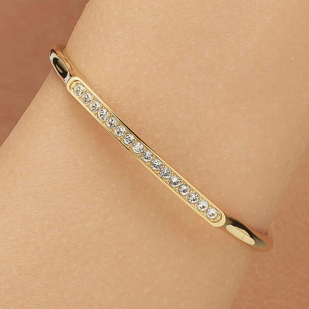 Náramek z chirurgické oceli pro ženy. Náramek má povrch pozlacený technologií PVD. Zlatý povrch náramku zvýrazňují prvotřídní bílé krystaly. Průměr náramku 60mm.