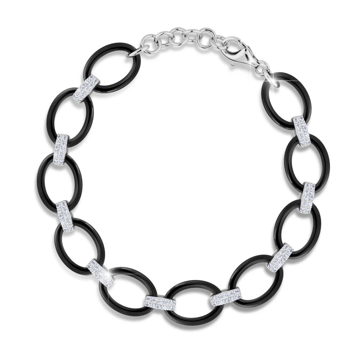 Elegantní náramek z keramiky, který kombinuje černé keramické části spojené stříbrnými sponkami osázenými třpytivými kubickými zirkony. Náramek je perfektním doplňkem svatebních či plesových šatů, ale stejně tak dobře se bude hodit k ležérnímu outfitu při posezení u drinku či kávy. Pokud se chcete stát královnou plesu, je tento náramek jasnou volbou. Náramkové zapínání je na karabinu. Náramek je široký 10mm, délka náramku 19cm.