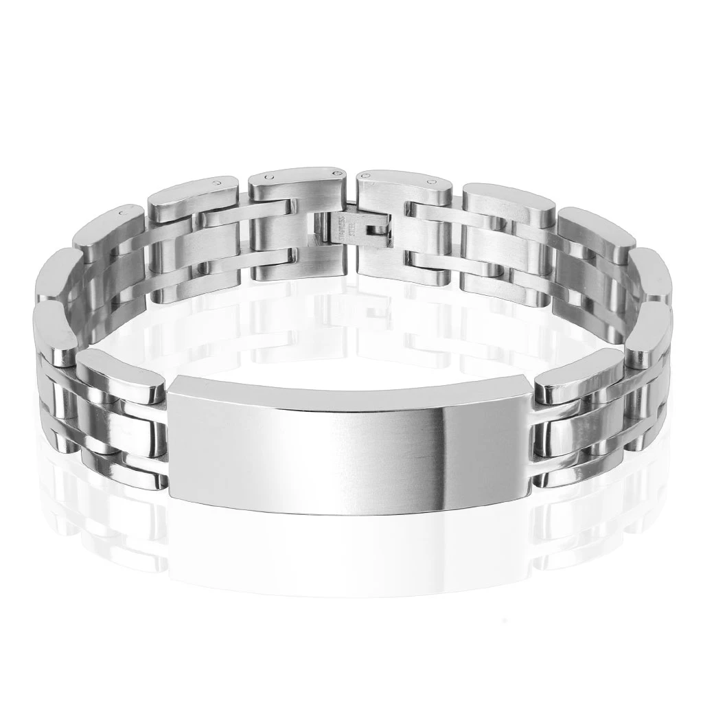 Ocelový náramek pro muže. Leštěný povrch, šířka 15mm, délka 21cm. Do destičky je možné provést rytinu. Text případné rytiny do náramku prosím uveďte do poznámky. Rytin je možna jak do vrchní tak do spodní strany náramku.