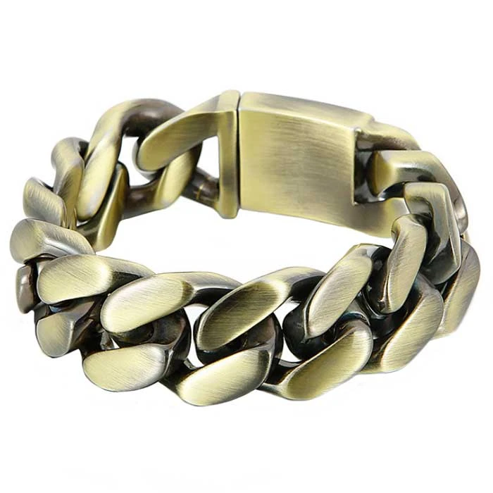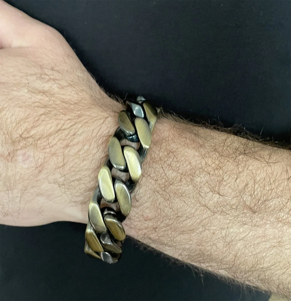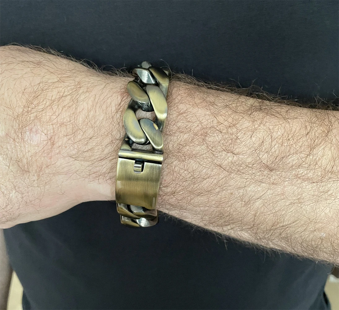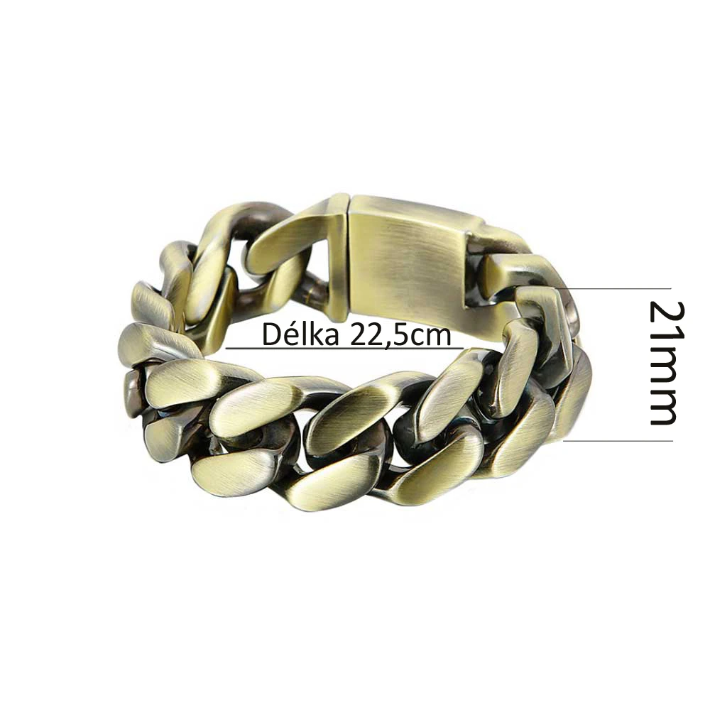 Ocelový náramek na ruku. Náramek má bronzovou barvu. Pánský náramek se zapínáním na masivní klip. Délka náramku 22,5cm, šířka 21mm.