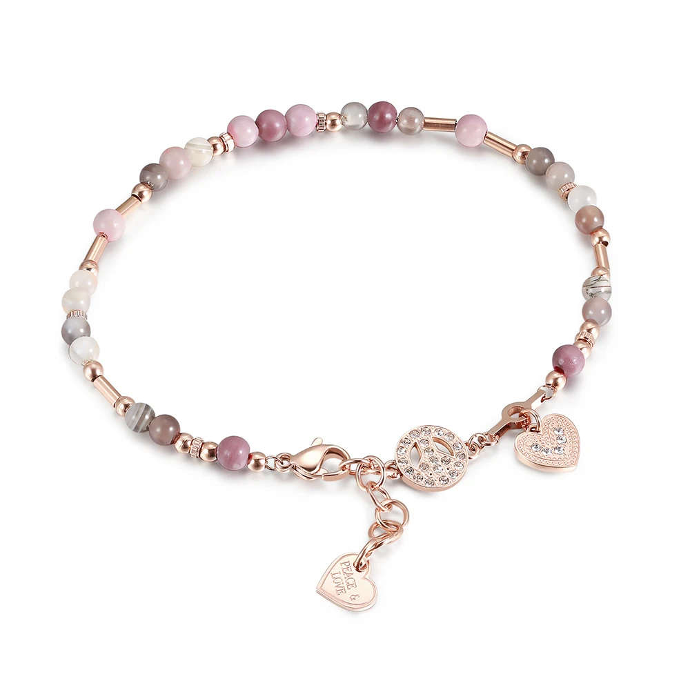 Řetízek na nohu z chirurgické oceli a minerálů rhodonit a achát. Řetízek na nohu má povrch upravený technologií PVD na barvu růžového zlata. Náramek má karabinové zapínání. Délka náramku je 24,5 cm.