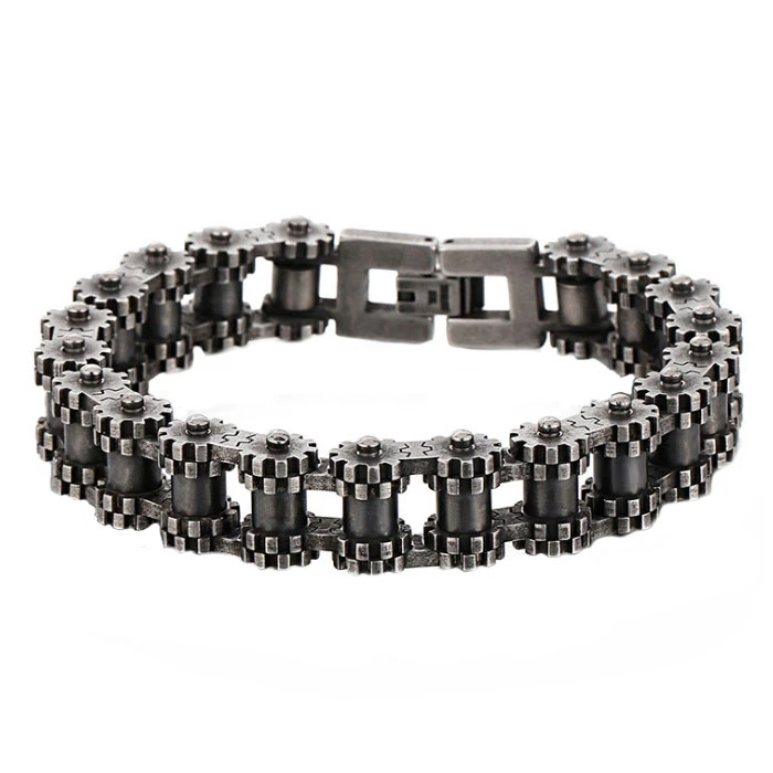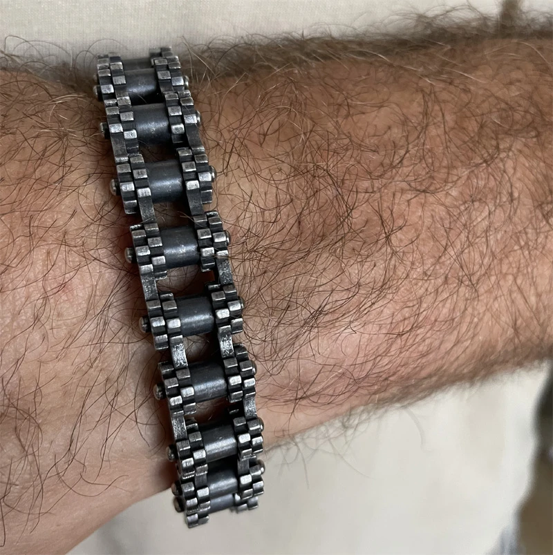 Náramek z chirurgické oceli řetěz imitující řetěz s ozubenými koly. Povrch náramku je upravený technologií PVD na barvu pistolové šedi. Délka náramku 23cm, šířka 12mm.
