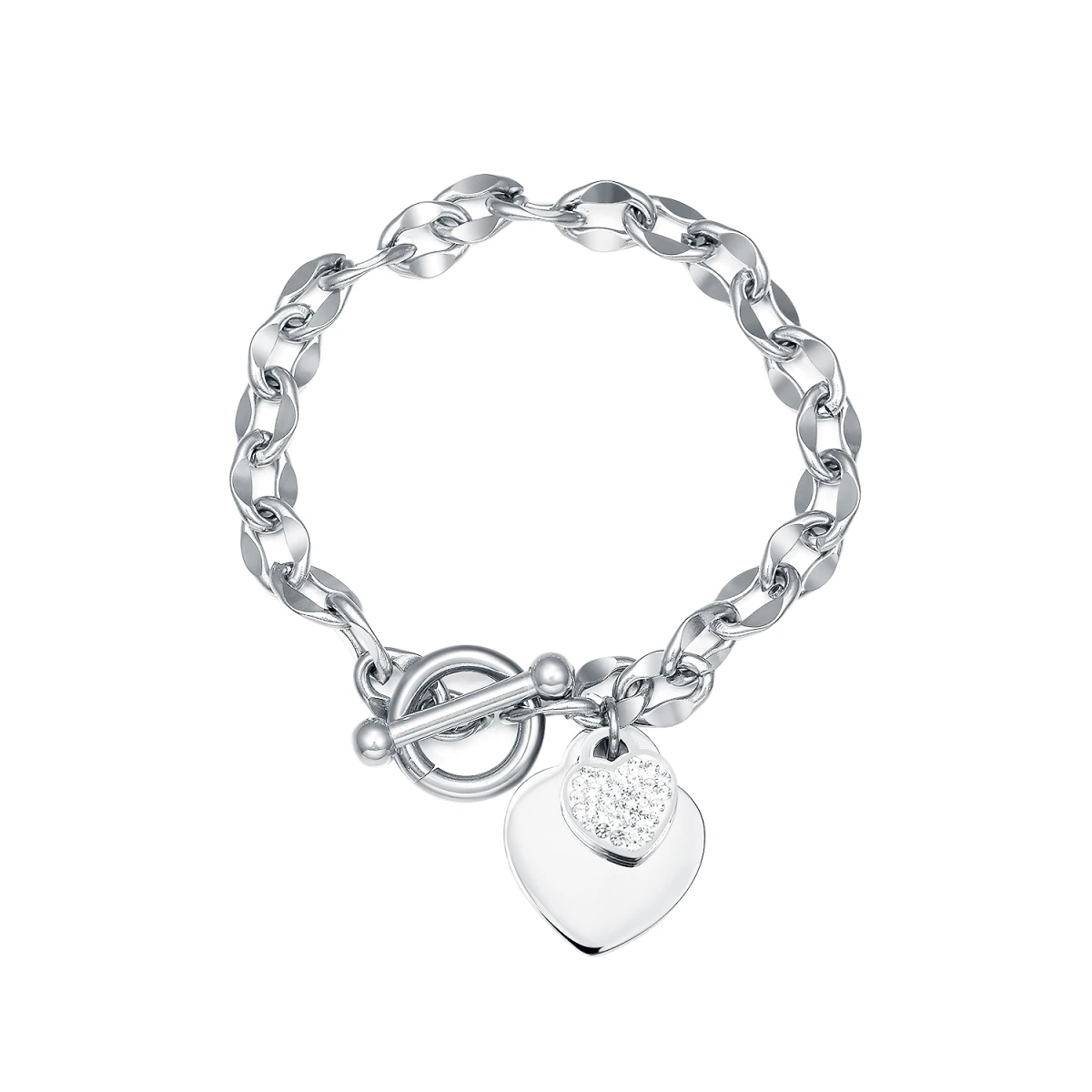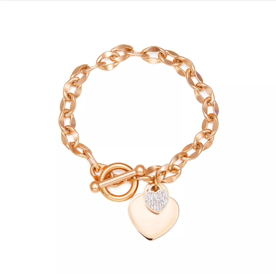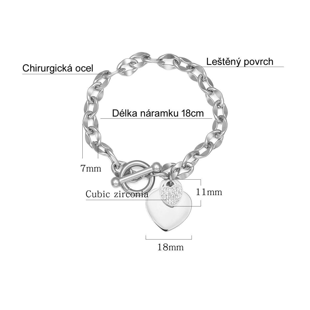 Ocelový náramek pro ženy a dívky s přívěsky srdíček. Menší srdíčko je ozdobené zirkony. Povrch náramku je leštěný, délka náramku 18cm. Náramek má oblíbené T zapínání.