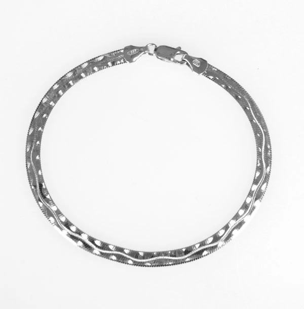 Náramek ze stříbra 925/000. Povrch náramku je porhodiovaný. Nanesené rhodium dává náramku krásnou barvu a lesk. Zapínání je karabinové. Šířka 4mm.