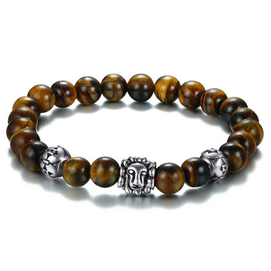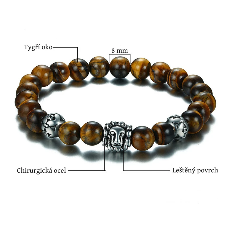Elegantní pružný náramek z korálků. Korálky jsou kombinace minerálu tygří oko a chirurgické oceli. Průměr korálků 8 mm.