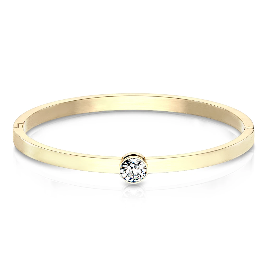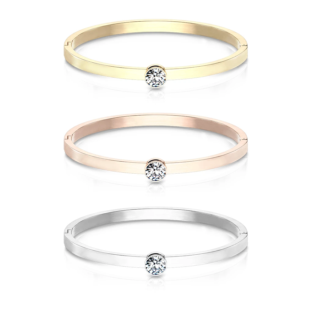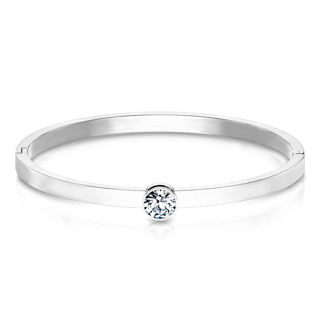 Dámský ocelový náramek se s kamínkem. Pevný náramek z chirurgické oceli s leštěným povrchem. Náramek je široký 4 mm, vnitřní rozměr 58x50 mm. Ozdoba se zirkonem má průměr 8 mm.