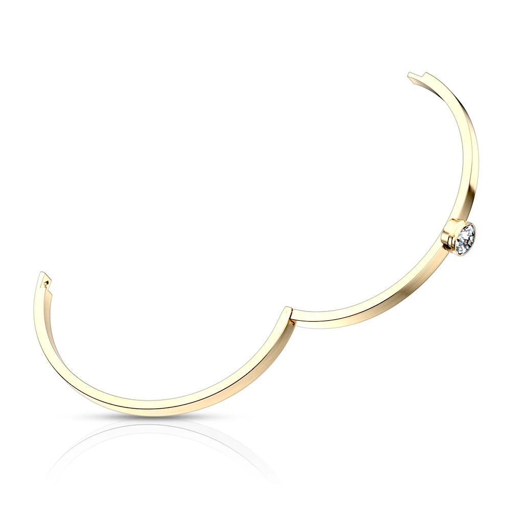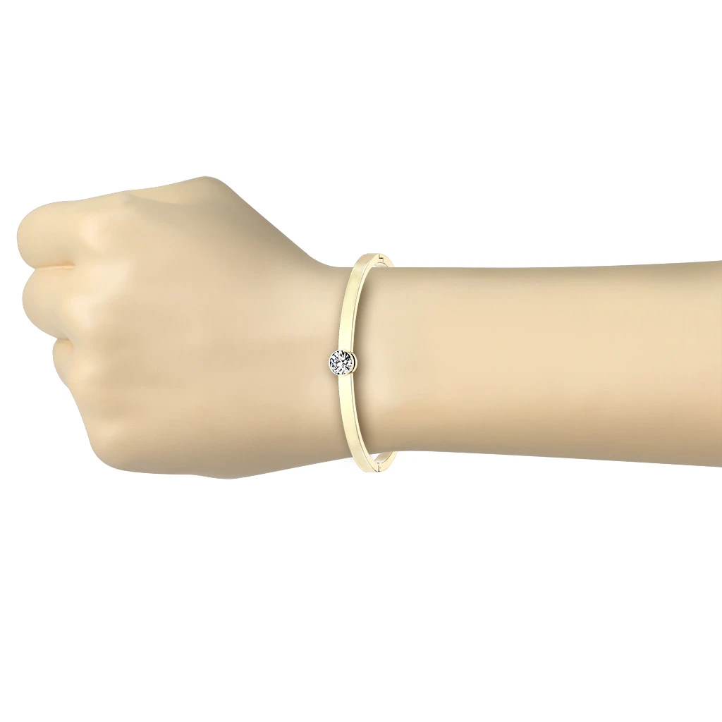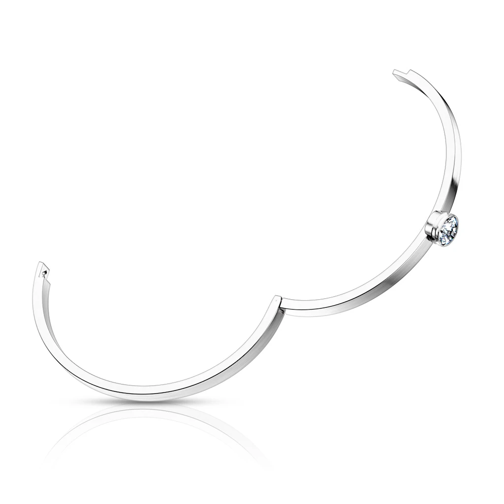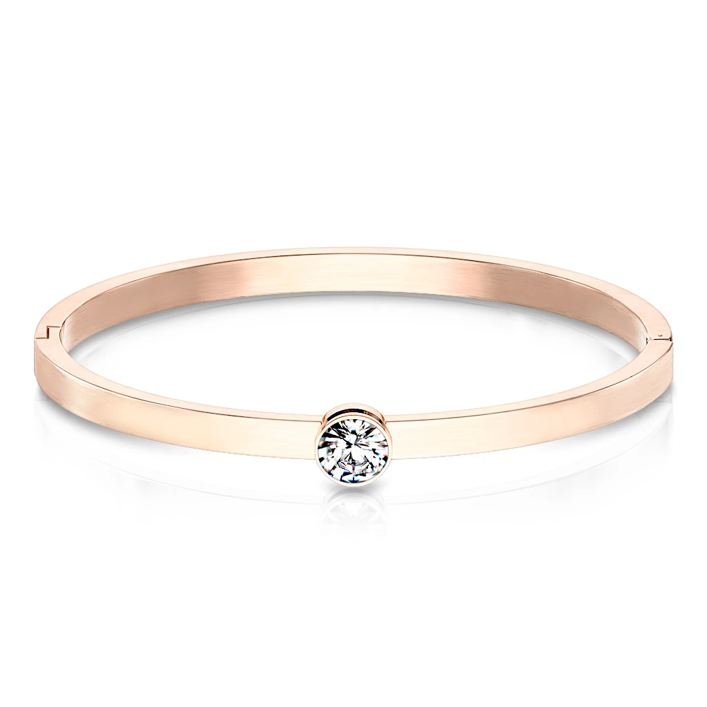 Dámský ocelový náramek se s kamínkem. Pevný náramek z chirurgické oceli s leštěným povrchem. Náramek je široký 4 mm, vnitřní rozměr 58x50 mm. Ozdoba se zirkonem má průměr 8 mm.