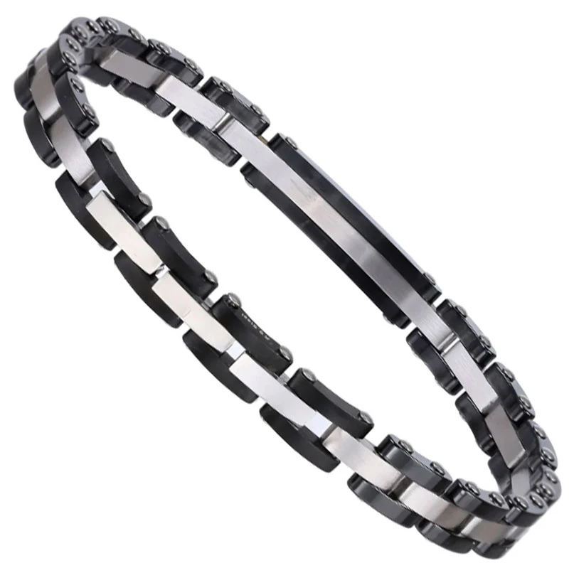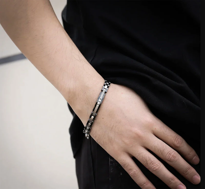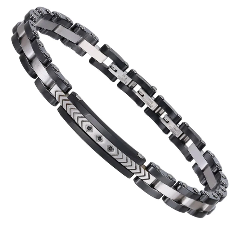 Elegantní náramek z chirurgické oceli a keramiky. Povrch černých keramických částí náramku je leštěný, ocelové články jsou matné. Destička se s decentním vzorem je osazena třemi černými zirkony. Černá keramika dodává náramku luxusní vzhled. Díky trojitému zapínání lze náramek zapnout na úrovni délek 19,5cm, 20,5cm 21,5cm. Náramek je široký 8mm.