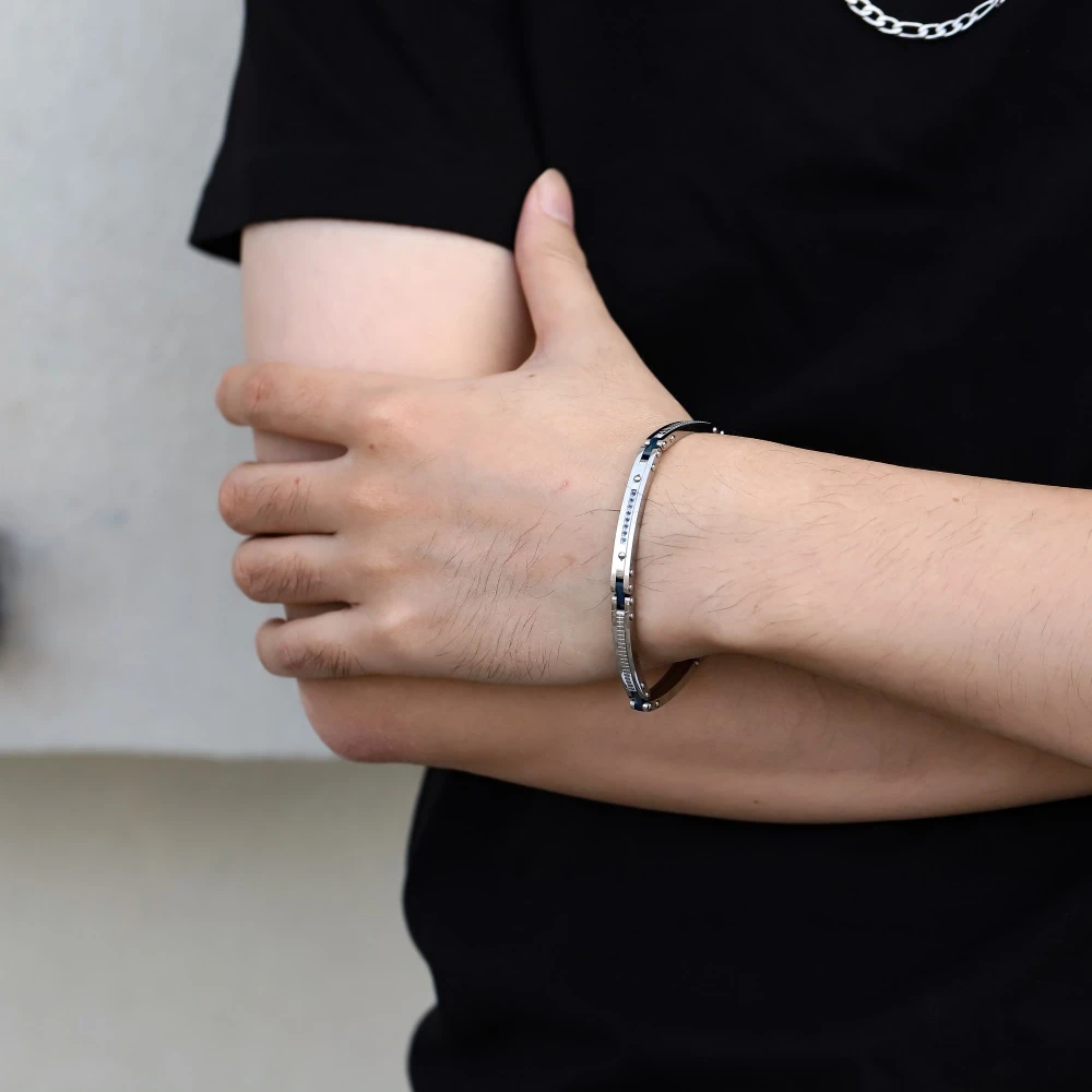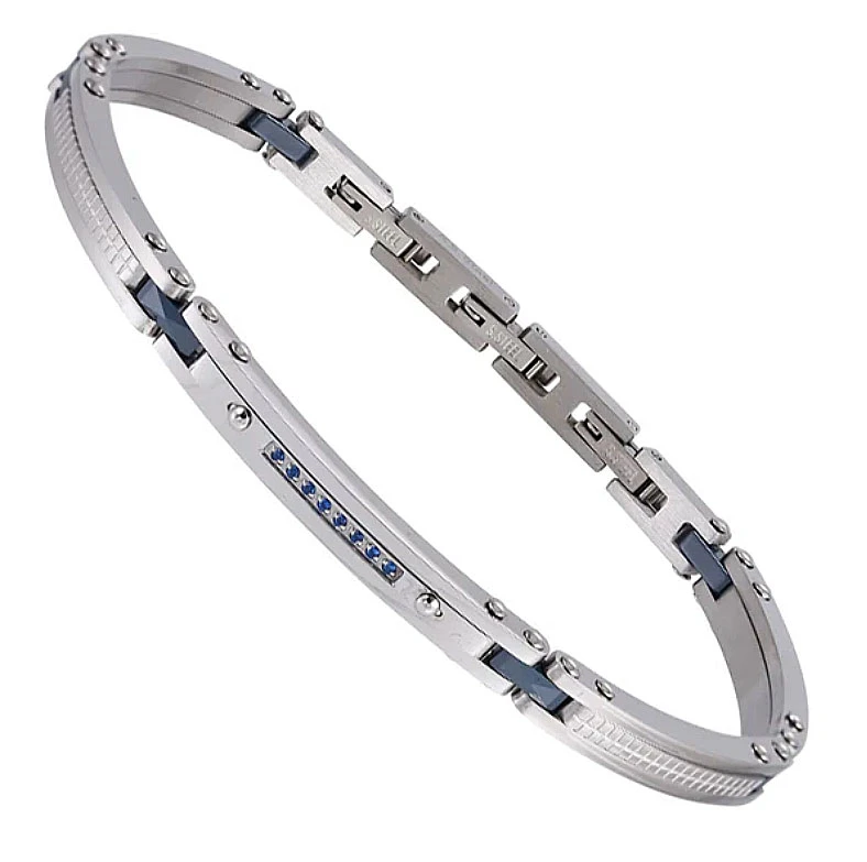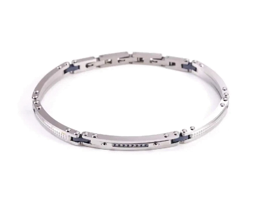 Elegantní náramek z chirurgické oceli a keramiky. Povrch náramku je leštěný, tmavě modrá keramika dodává náramku netradiční vzhled. Díky trojitému zapínání lze náramek zapnout na úrovni délek 19,5cm, 20,5cm 21,5cm. Náramek je široký 6mm.