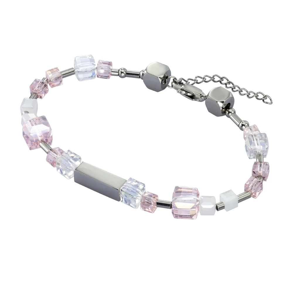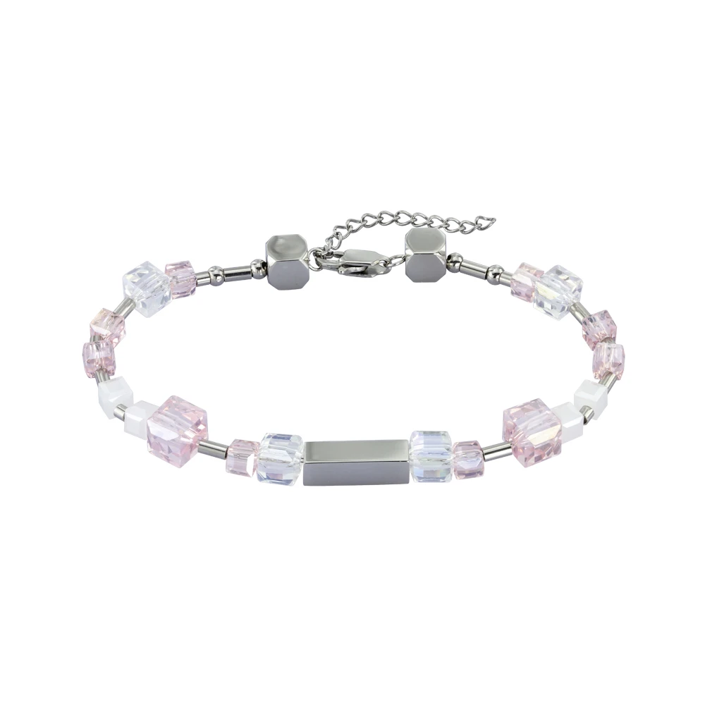 Dámský náramek z chirurgické oceli a hranatých skleněných korálků. Povrch ocelových částí je leštěný. Korálky jsou široké 7mm, 6mm a 5mm. Zapínání náramku je karabinové. Délku náramku lze nastavit v rozmezí 18-21cm.
