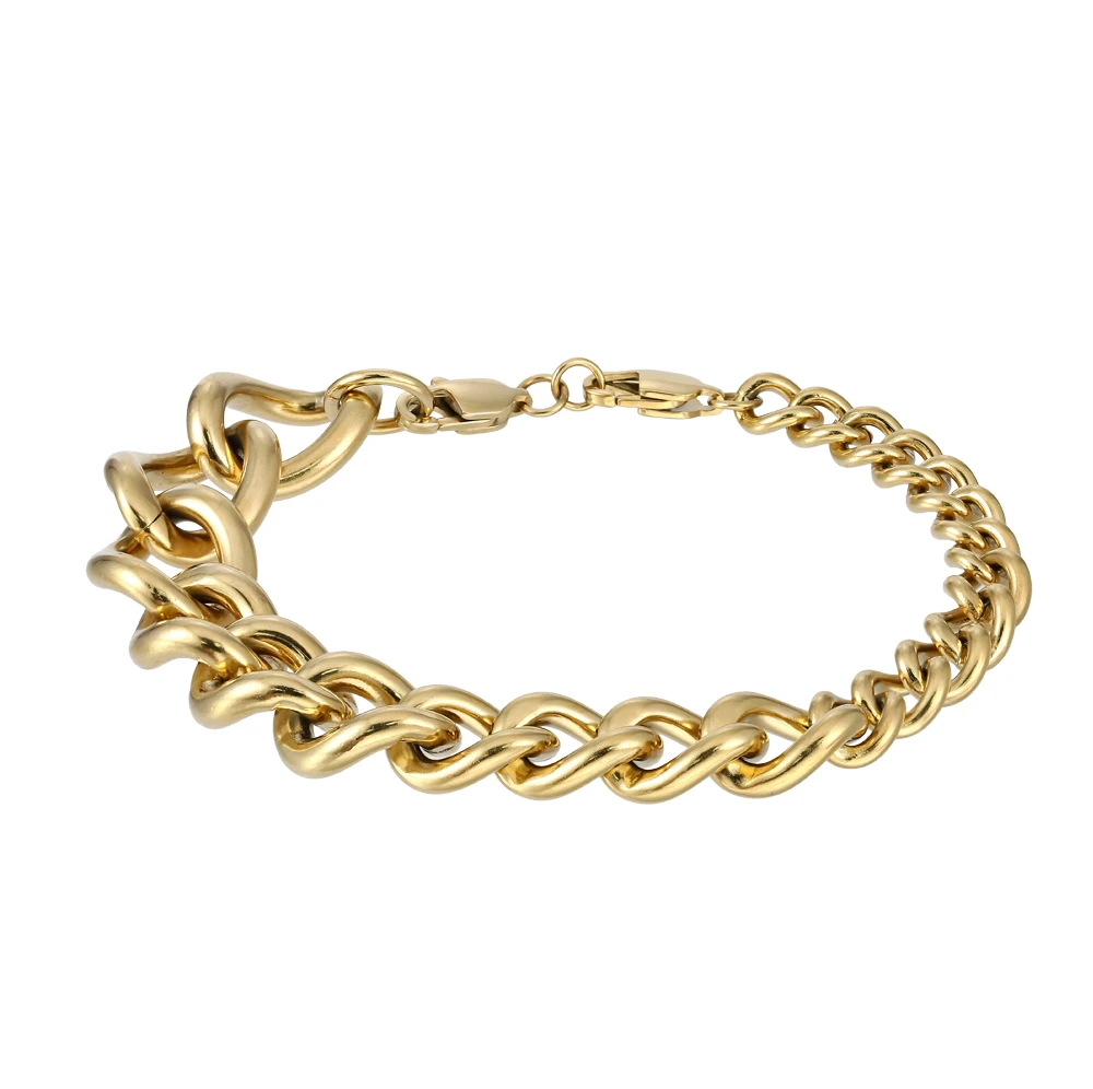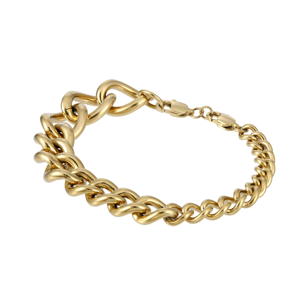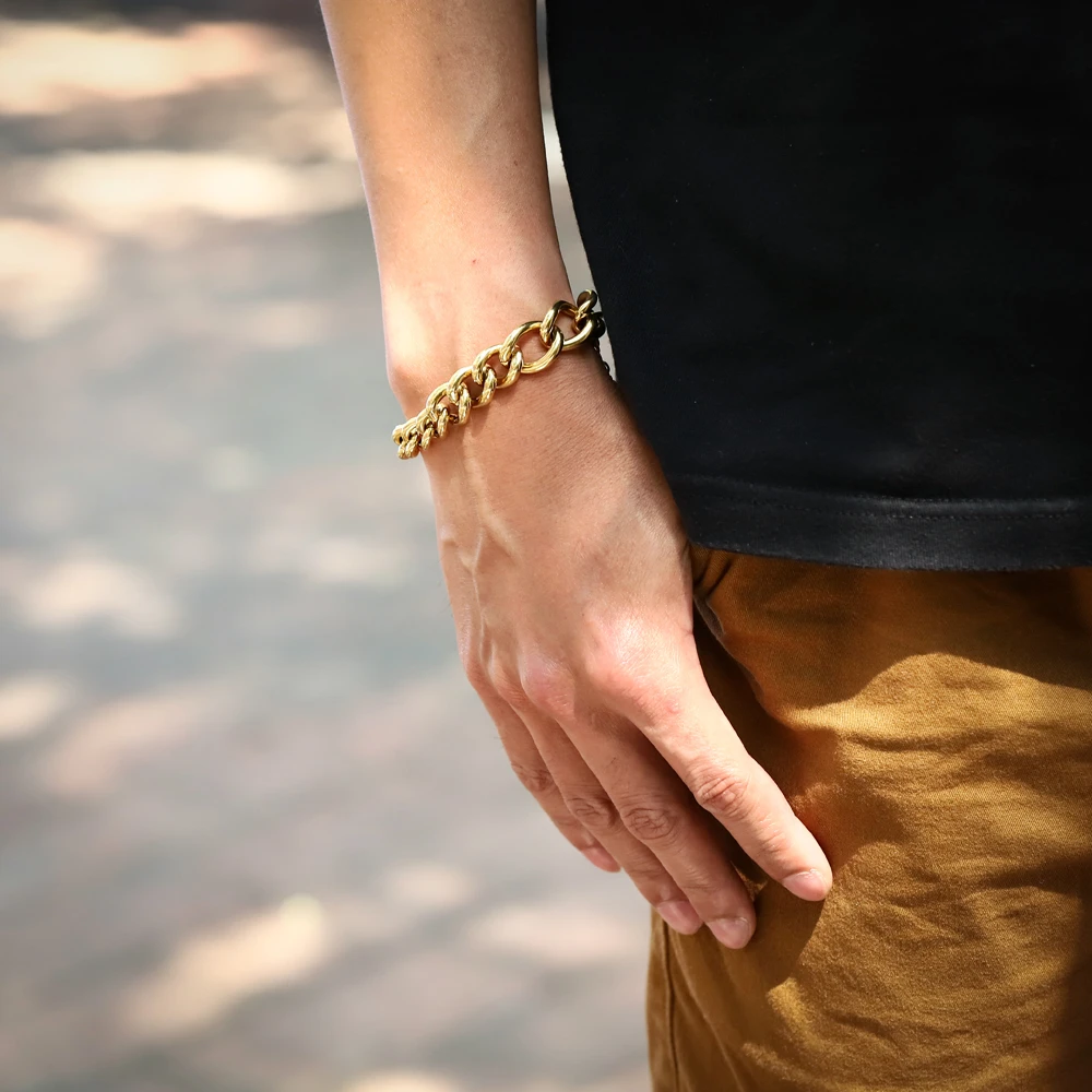Náramek na ruku vyrobený z chirurgické oceli. Povrch náramku je leštěný pozlacený technologií PVD. Náramek se postupně rozšiřuje ze 7mm na 15mm. Díky dvojitému karabinovému zapínání lze délku náramku nastavit na 21cm, nebo 19cm.