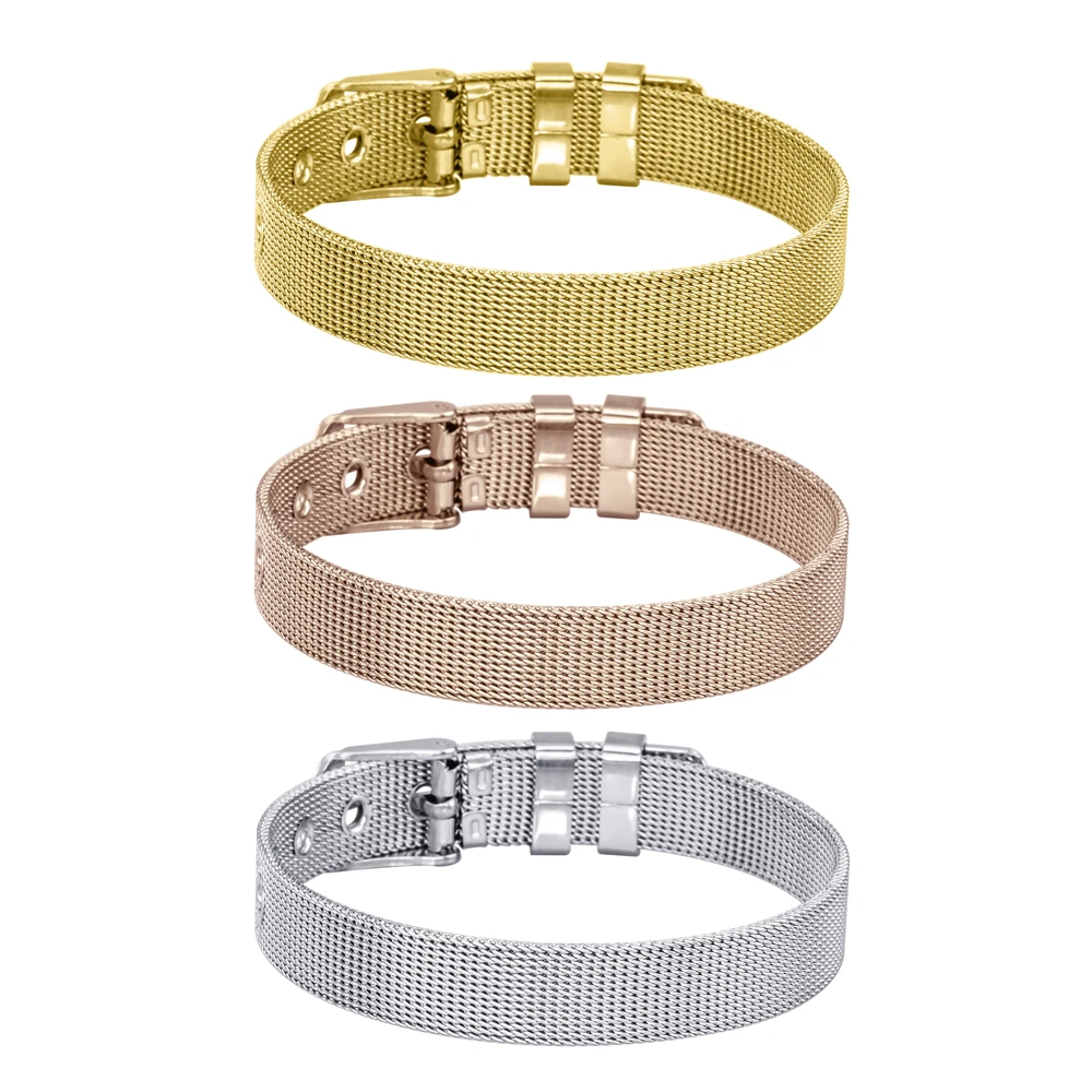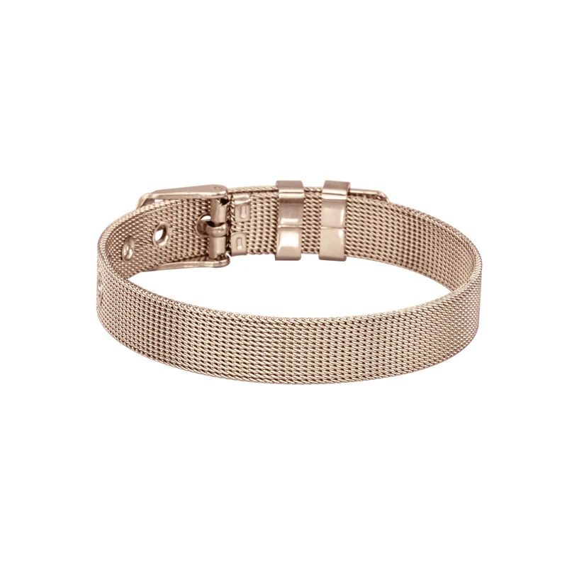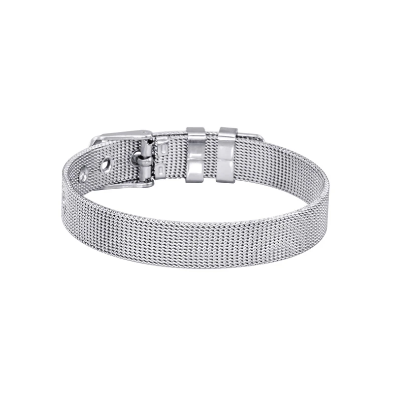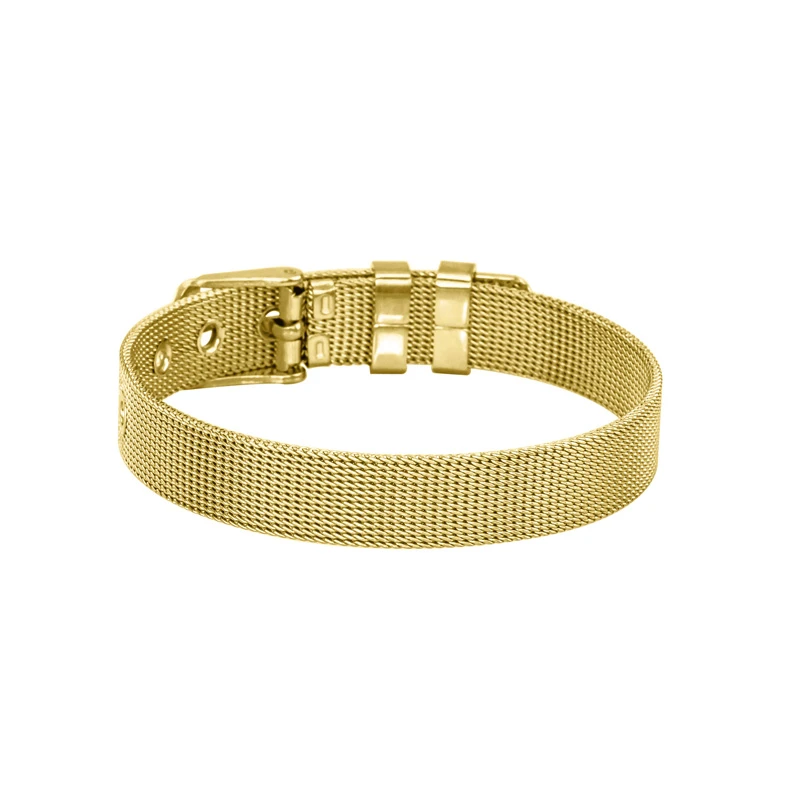 Dámský náramek z chirurgické oceli. Povrch náramku je leštěný. Náramek imituje řemínek k hodinkám. Zapínání náramku je na klasickou přezku. Náramek je široký 10 mm. Náramek lze zapnout na úrovni délek 14,15,16,17,18,19 cm.