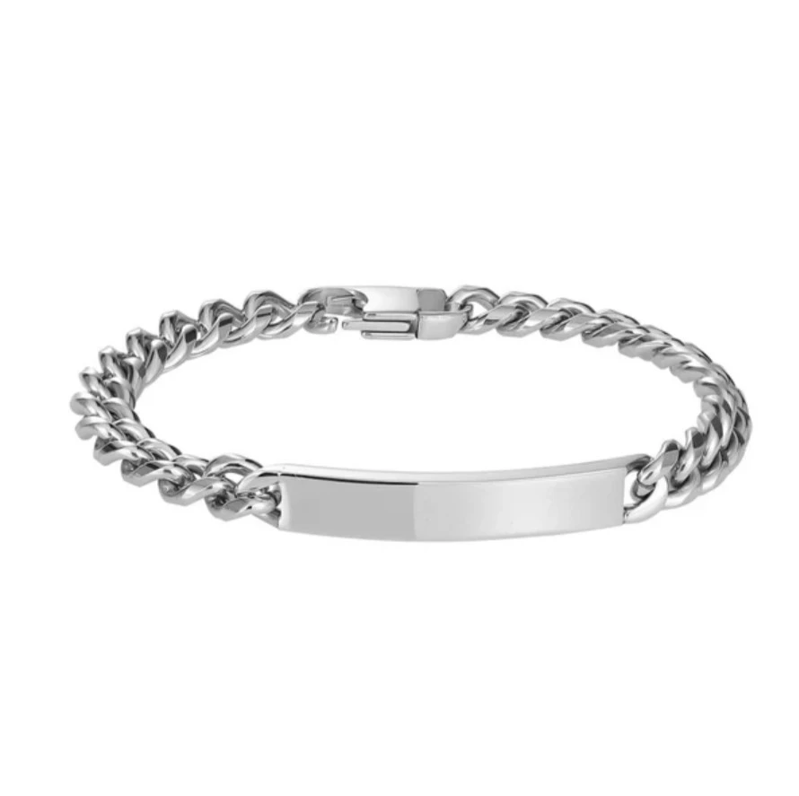 Náramek z chirurgické oceli s destičkou. Klasický pánský náramek, který nepodléhá módním trendům. Povrch náramku je leštěný. Náramek je široký 8mm, destička má rozměr 40x8mm. Délka náramku 21cm. Zapínání náramku je karabinové.