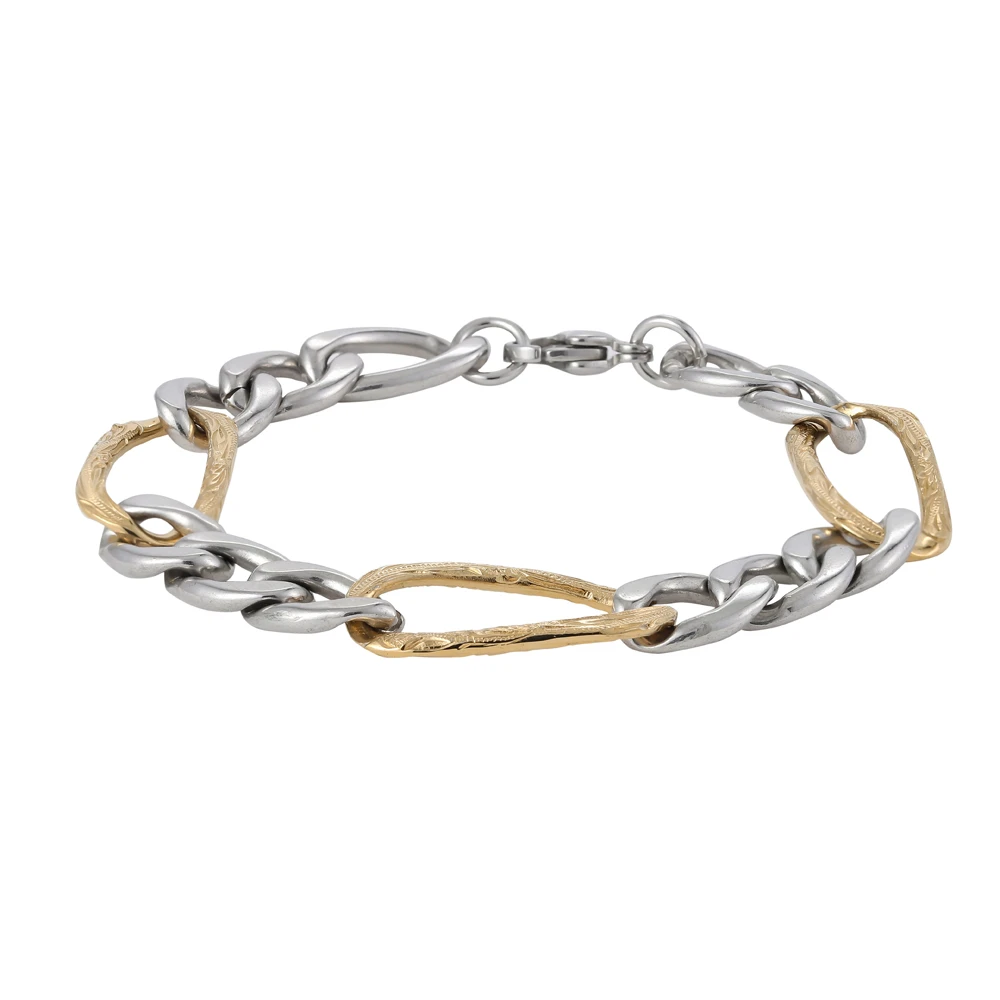 Náramek na ruku z chirurgické oceli. Náramek je klasický vzor figaro, který nikdy nevyjde z módy. Povrch náramku je leštěný, oválná očka mají gravírovaný povrch pozlacený technologií PVD. Zapínání náramku je karabinové. Náramek je dlouhý 21cm, šířka 12mm. Na přání lze délku náramku zdarma zkrátit.
