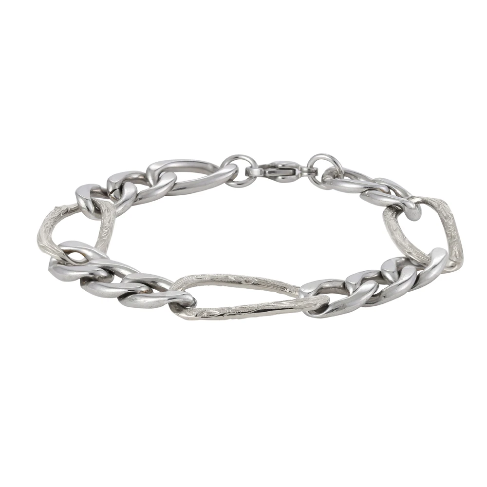 Náramek na ruku z chirurgické oceli. Náramek je klasický vzor figaro, který nikdy nevyjde z módy. Povrch náramku je leštěný, oválná očka mají gravírovaný povrch. Zapínání náramku je karabinové. Náramek je dlouhý 21cm, šířka 12mm. Na přání lze délku náramku zdarma zkrátit.
