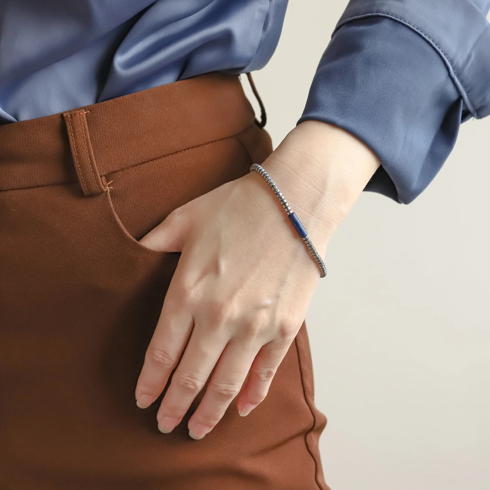 Jemný náramek na ruku z hematitových korálků a chirurgické oceli. Modrý korálek je minerál Lapis Lazuli. Hematitové korálky mají průměr 3mm, modrý korálek z Lapis Lazuli má průměr 4mm. Zapínání náramku je karabinové. Délku náramku lze nastavit v rozmezí 18-21cm.