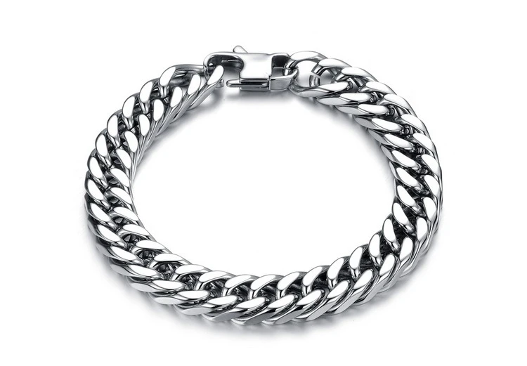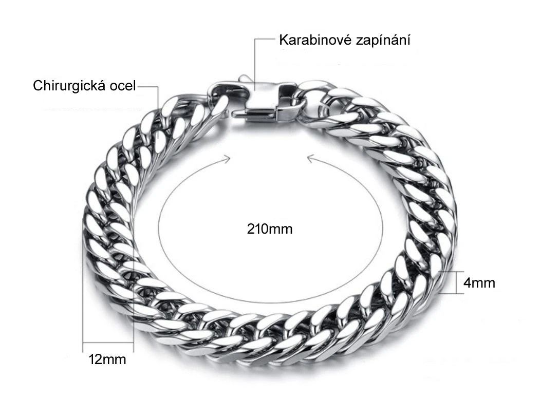 Náramek na ruku z chirurgické oceli. Povrch náramku je leštěný. Náramek se zapíná pomocí karabiny. Délka náramku 21 cm, šířka 10 mm. Na přání je možné náramek zdarma zkrátit.