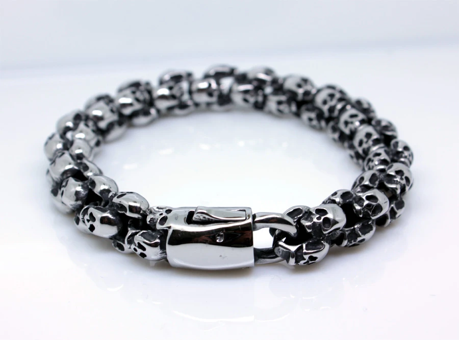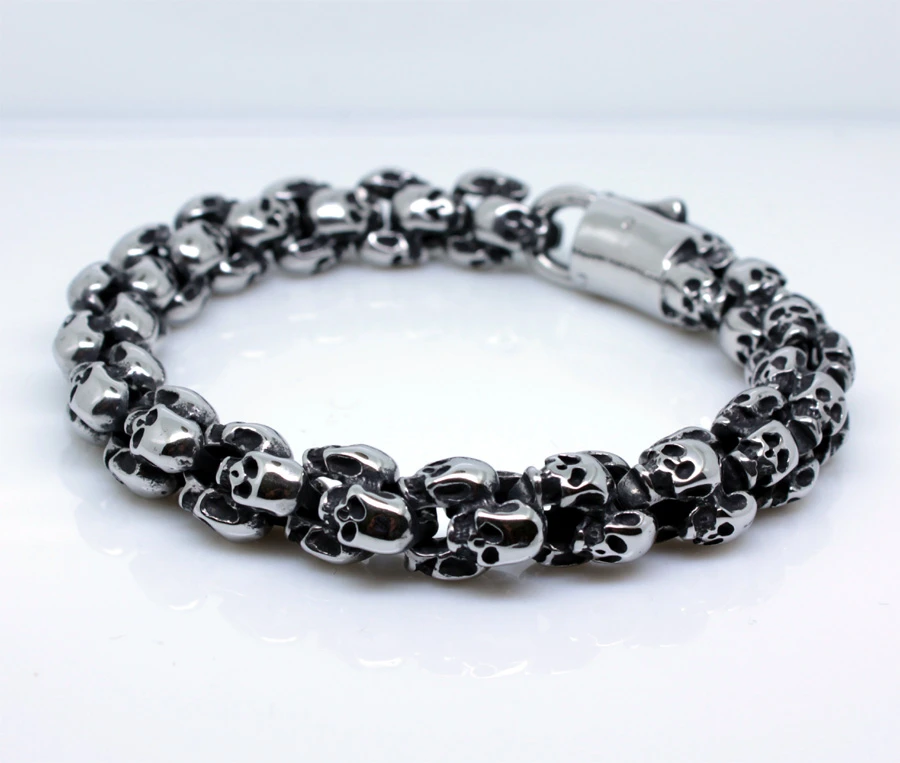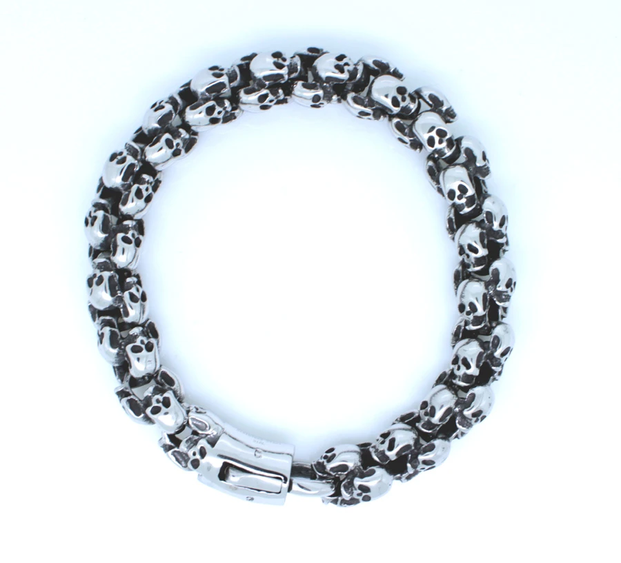 Pánský náramek z chirurgické oceli. Články náramku o průměru 12 mm tvoří navzájem propojené lebky. Povrch náramku je leštěný s černými detaily. Náramek je dlouhý 22,5 cm. Zapínání je na karabinu.