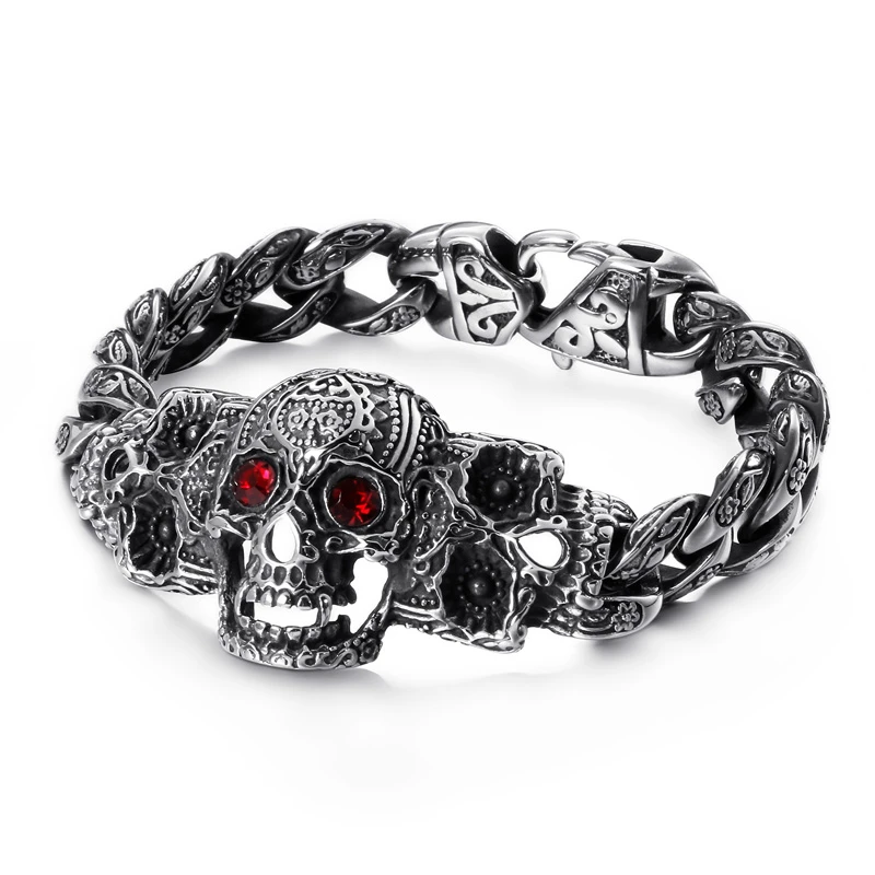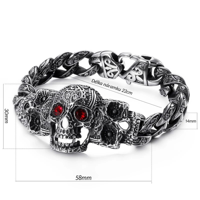 Náramek z chirurgické oceli pro motorkáře s hlavami lebek. Největší lebka má v očních důlcích zasazené tmavě červené kamínky. Zapínání náramku je karabinové. Náramek je dlouhý 22cm, šířka řetězu 14mm. Rozměry náramku najdete zobrazené na podpůrné fotografii.