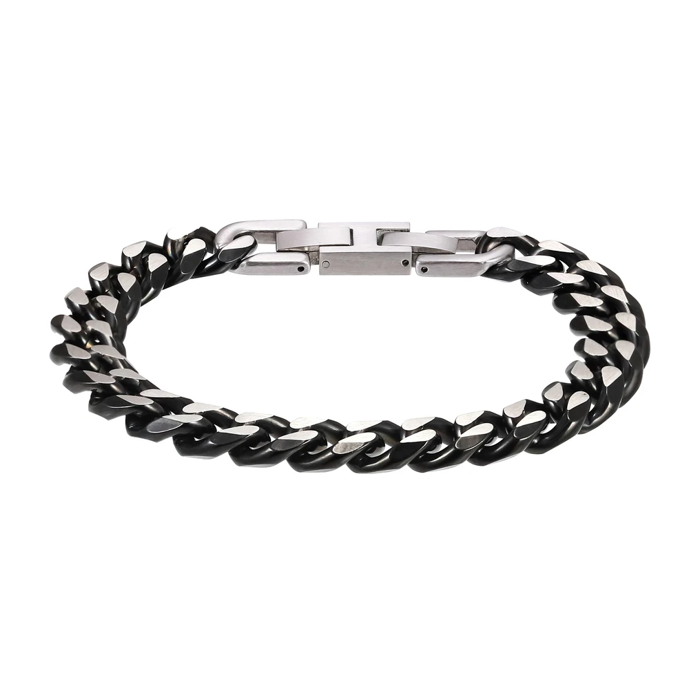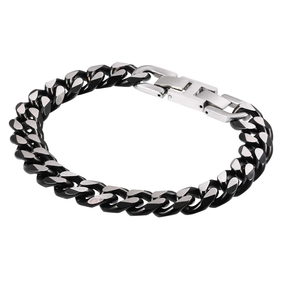 Náramek na ruku z chirurgické oceli. Povrch náramku je kombinace matné povrchové úpravy a černé PVD barvy. Náramek je široký 13mm, díky dvojitému zapínání lze délku náramku nastavit v délce 19,5cm a 21cm.