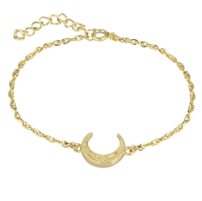 Jemný dámský náramek z chirurgické oceli s ozdobou srpku měsíce. Srpek měsíce je z jedné strany leštěný, z druhé strany má vygravírovaný vzor květů. Průměr srpku 12mm. Řetízkové části náramku mají průměr 1,8mm. Délka náramku lze nastavit v rozmezí 15,5 - 18,5cm.
