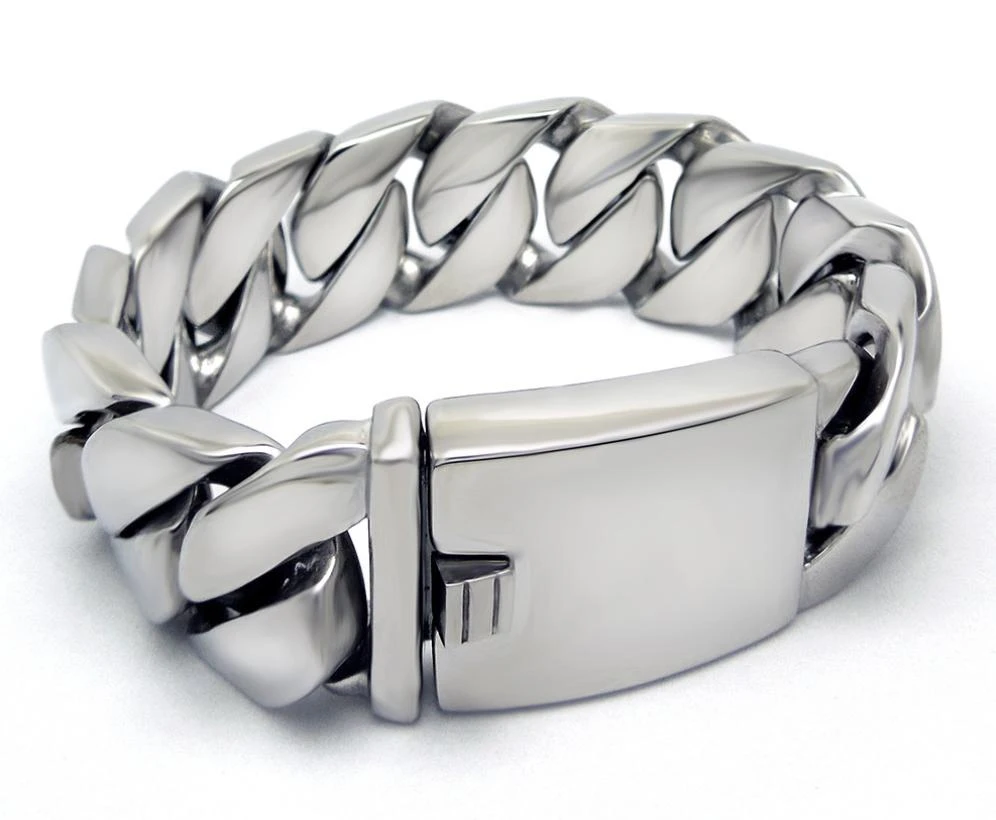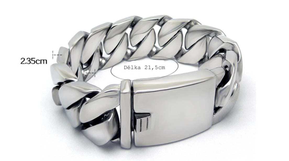 Masivní ocelový náramek pro muže s leštěným povrchem. Náramek je široký 2,35 cm. Zapínání je na masivní klip. Délka náramku 21,5cm.