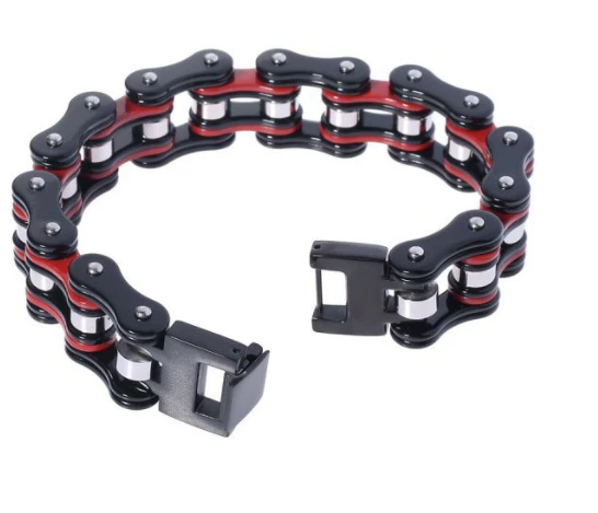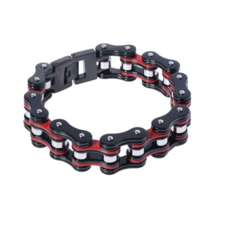 Ocelový náramek pro muže imitující motocyklový řetěz. Povrch náramku je upravený černou a červenou PVD barvou. Náramek je široký 16mm, délka náramku 22,5cm.