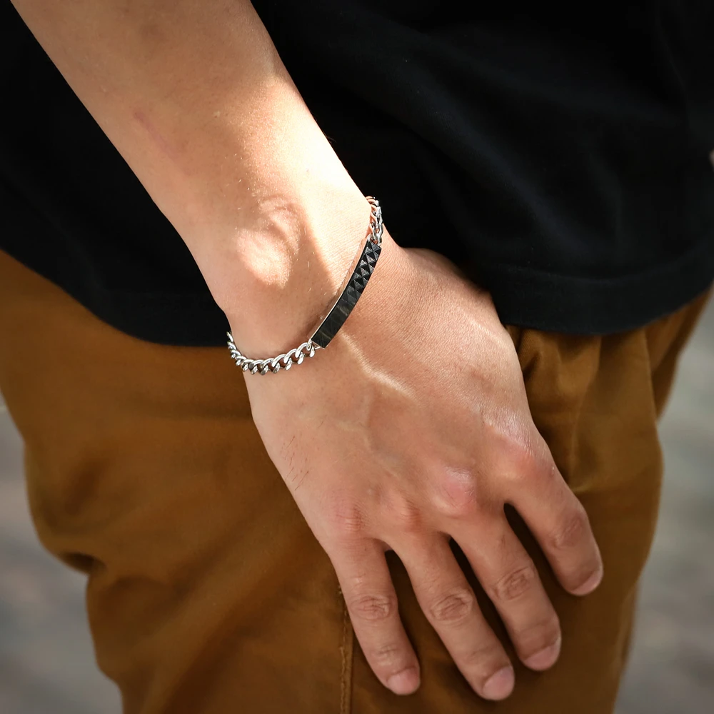 Náramek na ruku z chirurgické oceli. Povrch náramku je leštěný. Černá destička ozdobená vzorem má rozměr 7x40mm. Náramek je široký 7mm, délku náramku lze díky dvojitému zapínání nastavit na 19 cm, nebo 21 cm.