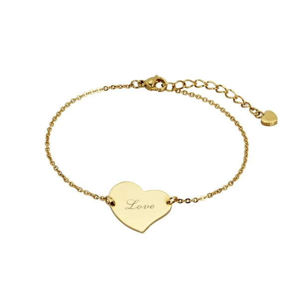 Jemný dámský náramek z chirurgické oceli se srdíčkem. Povrch náramku je pozlacený technologií PVD. Srdíčko nese nápis "Love". Rozměr srdíčka 18x15mm. Řetízkové části náramku mají průměr 1,0mm. Délka náramku lze nastavit v rozmezí 17-20cm. Náramek je dodávaný v originál semišové sáčku s logem Inori.