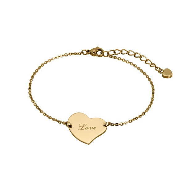 Jemný dámský náramek z chirurgické oceli se srdíčkem. Povrch náramku je pozlacený technologií PVD. Srdíčko nese nápis "Love". Rozměr srdíčka 18x15mm. Řetízkové části náramku mají průměr 1,0mm. Délka náramku lze nastavit v rozmezí 17-20cm. Náramek je dodávaný v originál semišové sáčku s logem Inori.