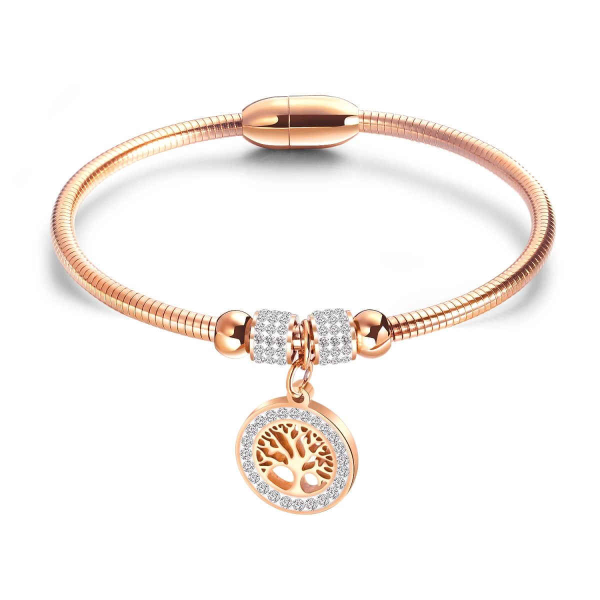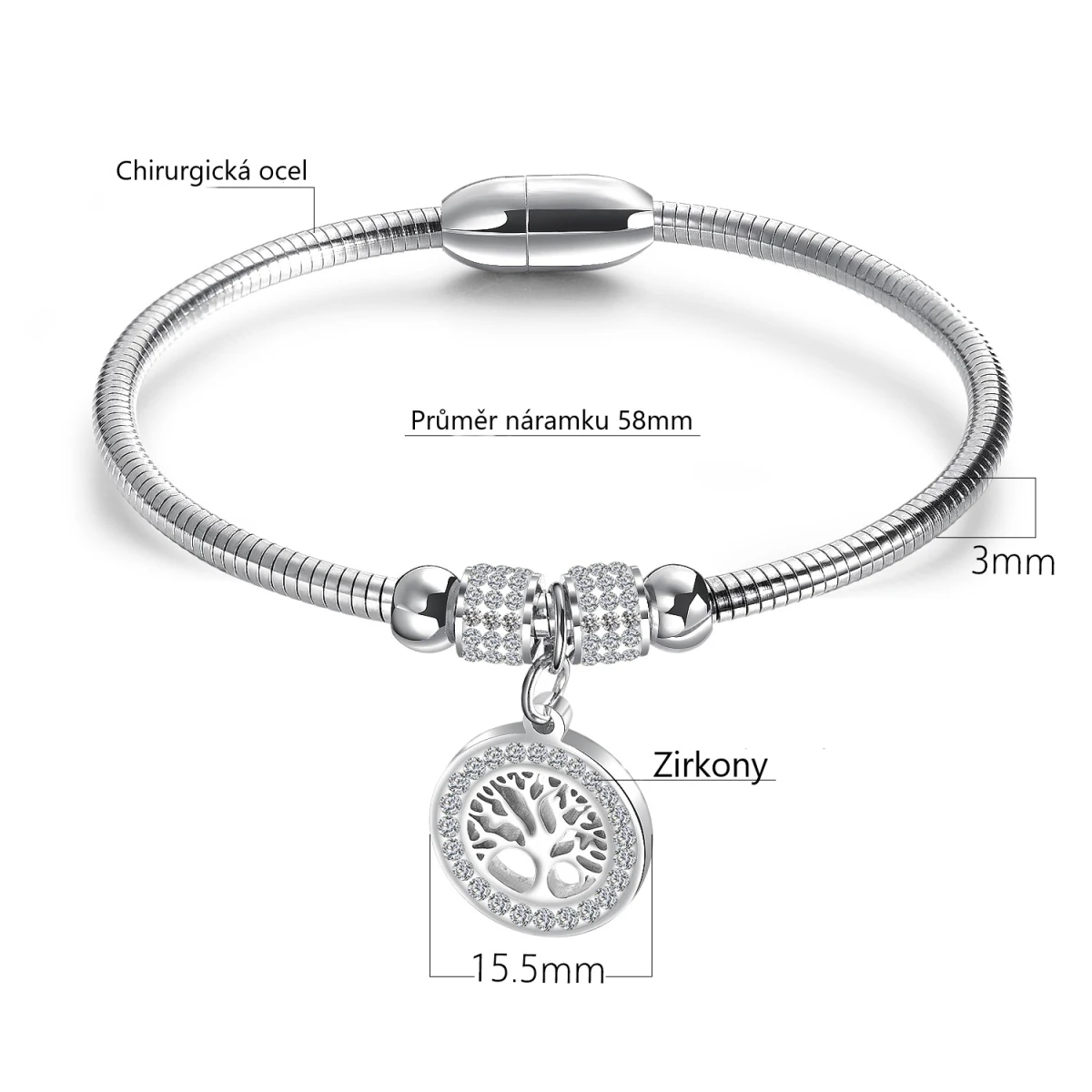 Pevný ocelový náramek s ozdobou stromu života. Náramek má magnetické zapínání. Korálky a ozdoba stromu života jsou osazené zirkony. Vnitřní průměr náramku 58mm, šířka náramku 3mm.