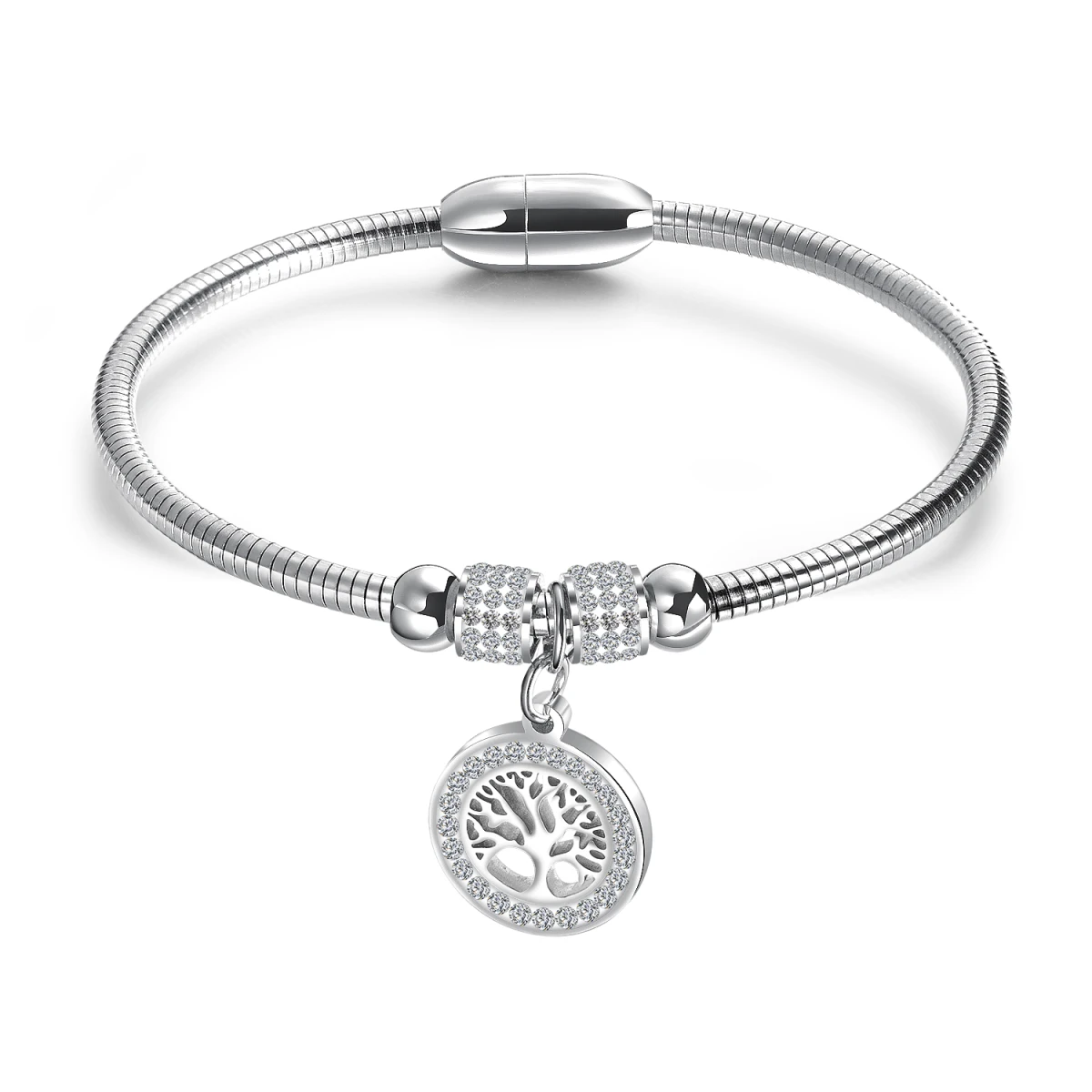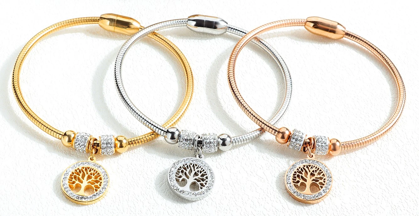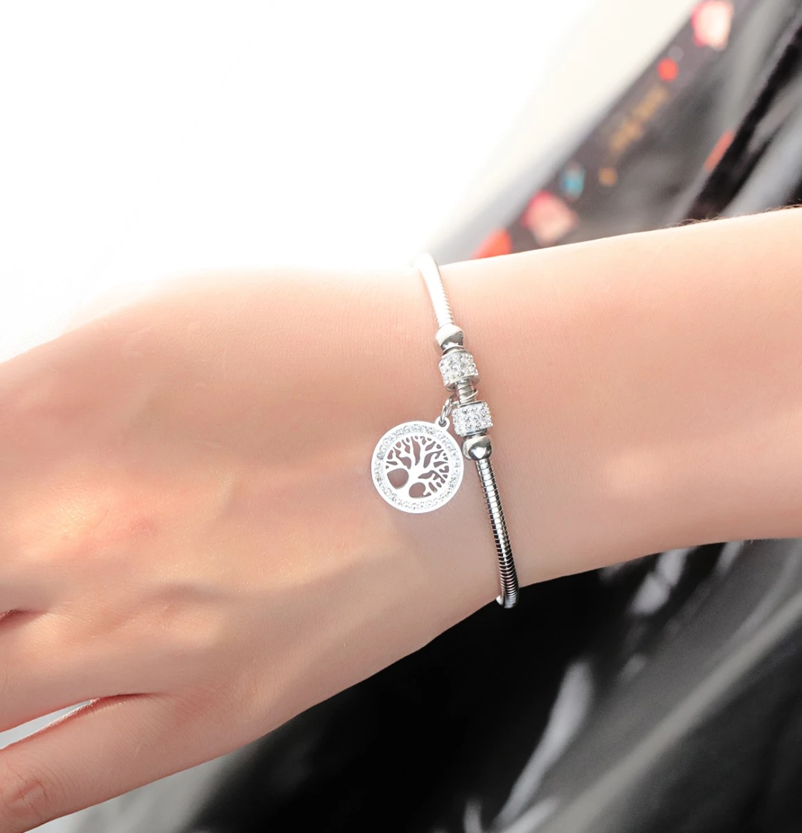 Dámský ocelový náramek s ozdobou stromu života. Elegantní náramek z chirurgické oceli,který má stejné vlastnosti, pro které se ocelové šperky stále těší značné oblibě. Mezi tyto vlastnosti patří především nevyvolávání alergických reakcí, šperky z chirurgické oceli jsou odolné proti poškození, neoxidují a jsou barevně stálé.