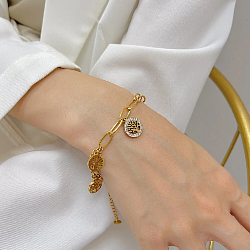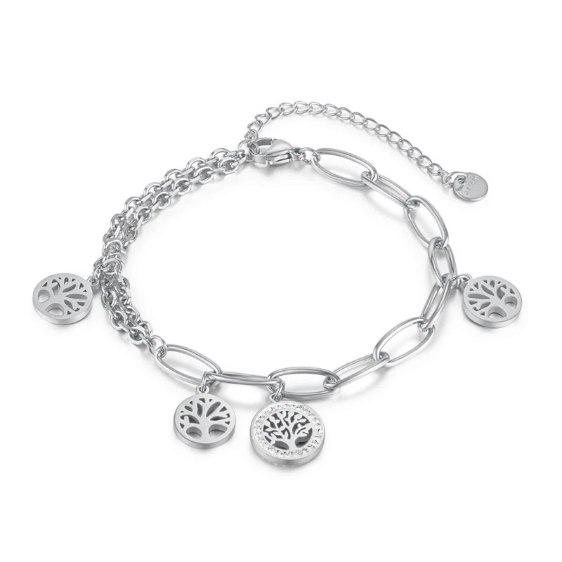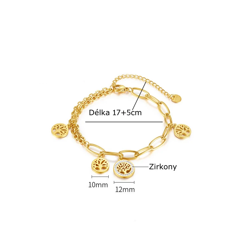 Ocelový náramek s přívěsky se stromem života. Povrch náramku je leštěný. Délku náramku lze nastavit v rozmezí 17-22cm.