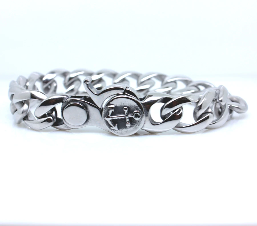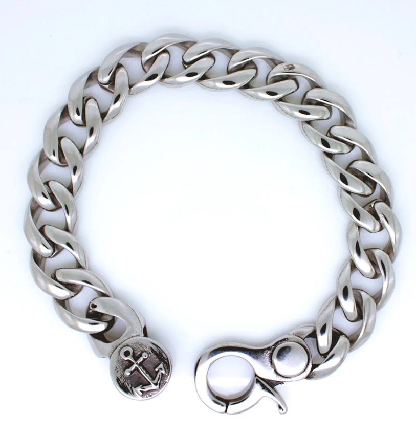 Náramek na ruku z chirurgické oceli se symbolem kotvy. Náramek má leštěný povrch. Zapínání náramku je na masivní karabinu, která je ozdobena kotvou. Délka náramku 22,5 cm, šířka 13 mm.