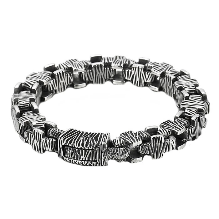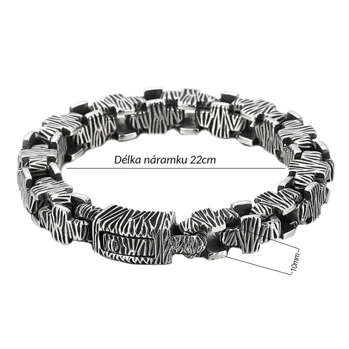 Pánský náramek z chirurgické oceli. Povrch náramku je se vzorem a kombinuje lesk a patinu. Náramek má čtvercový průřez 10x10mm. Zapínání náramku je klip. Náramek je dlouhý 22cm.