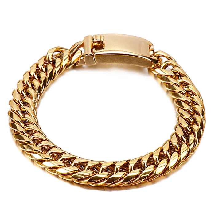 Pánský náramek z chirurgické oceli s leštěným povrchem pozlaceným technologií PVD. Zapínání náramku je na masivní klip. Náramek je dlouhý 21,5cm, šířka 12mm.