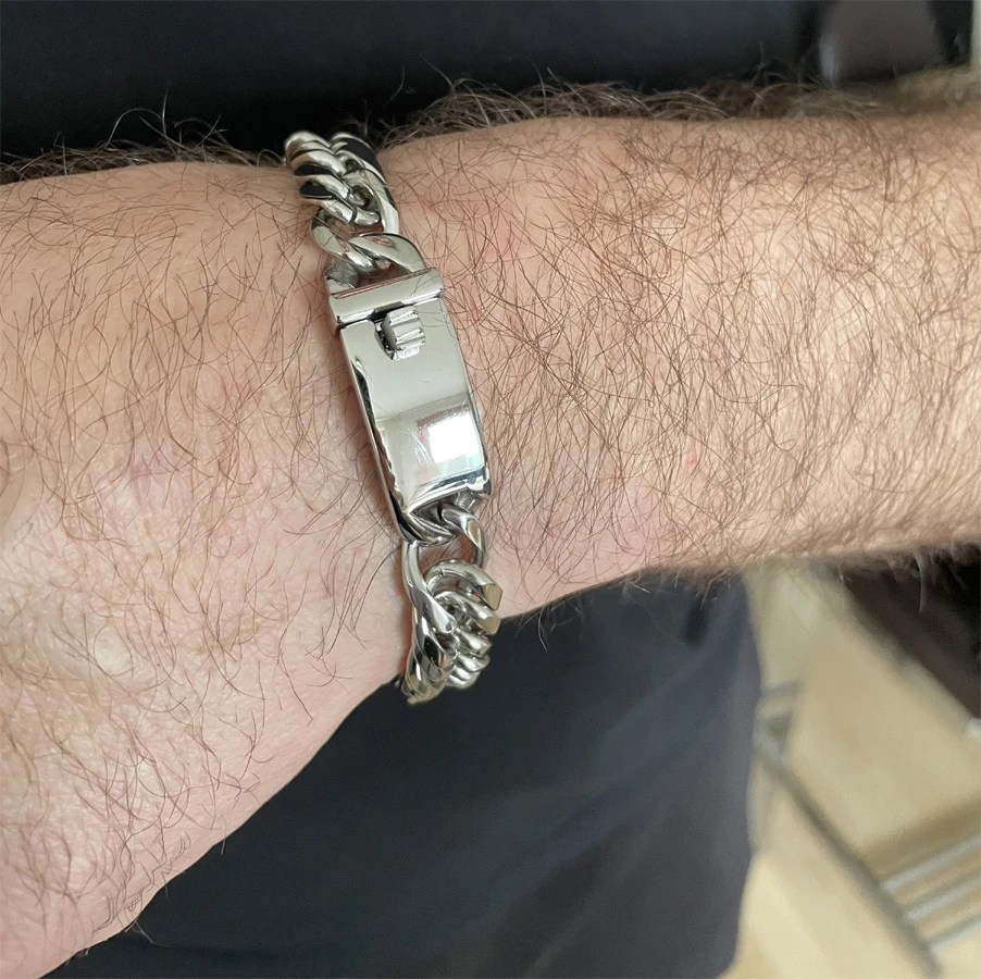 Pánský náramek z chirurgické oceli s leštěným povrchem. Zapínání náramku je na masivní klip. Náramek je dlouhý 21,5cm, šířka 12mm.