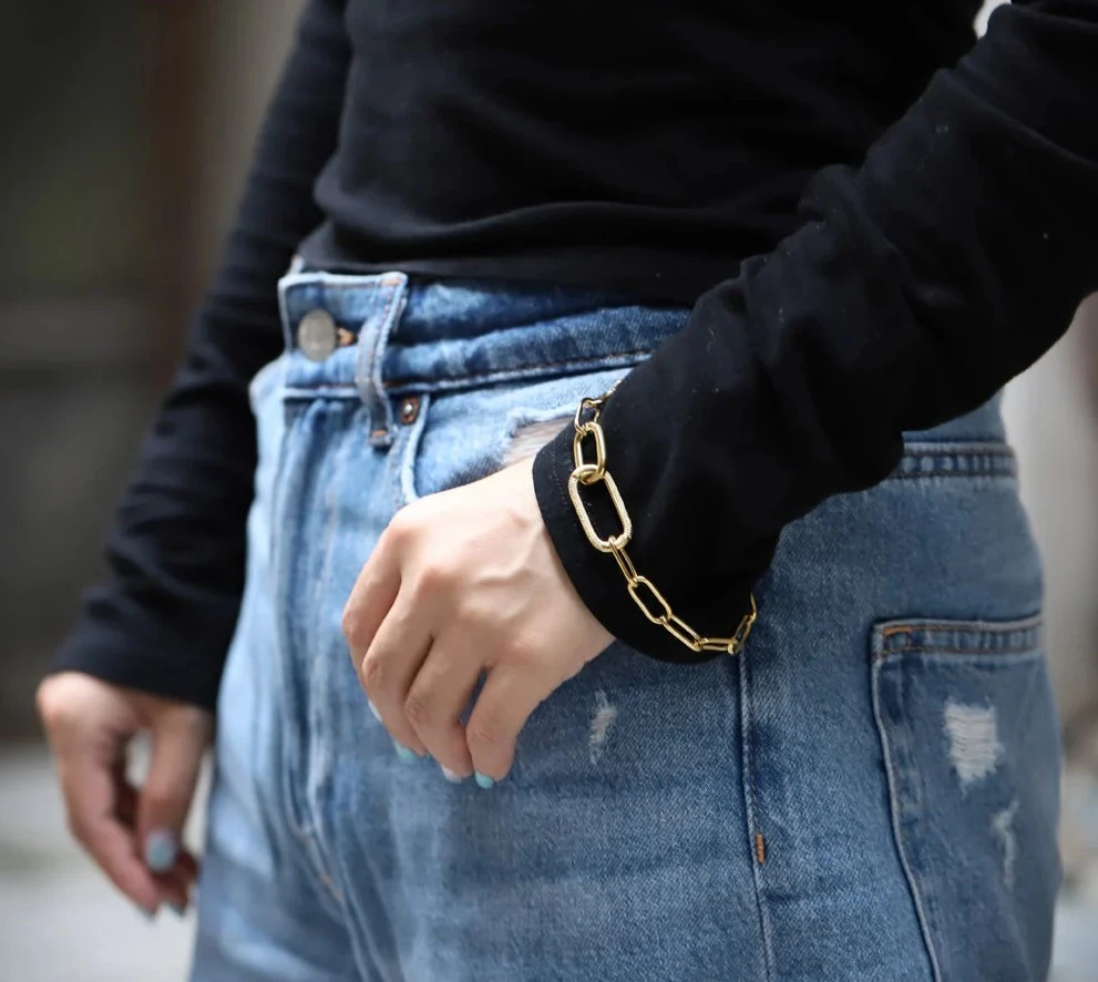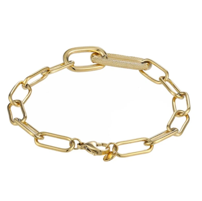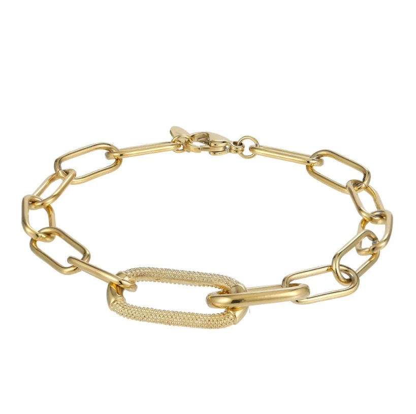Dámský náramek z chirurgické oceli s leštěným pozlaceným povrchem. Elegantní nadčasový náramek, který díky kvalitní chirurgické oceli vydrží dlouhou dobu. Velké očko ve středu náramku má rozměr 27x13mm, ostatní očka mají rozměr 16x8mm. Náramkové zapínání je karabinové, délka náramku 21 cm.