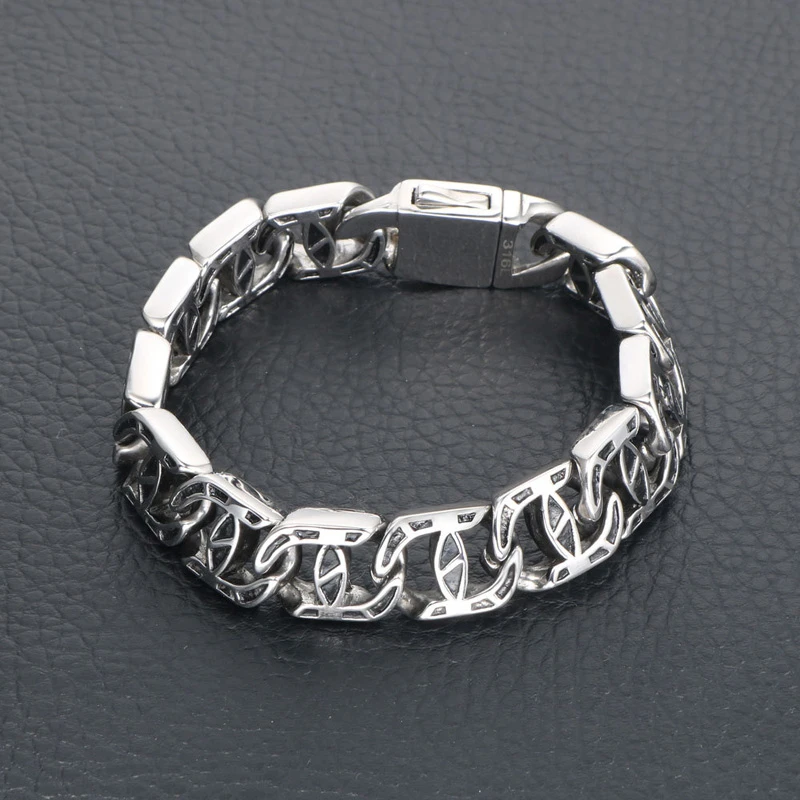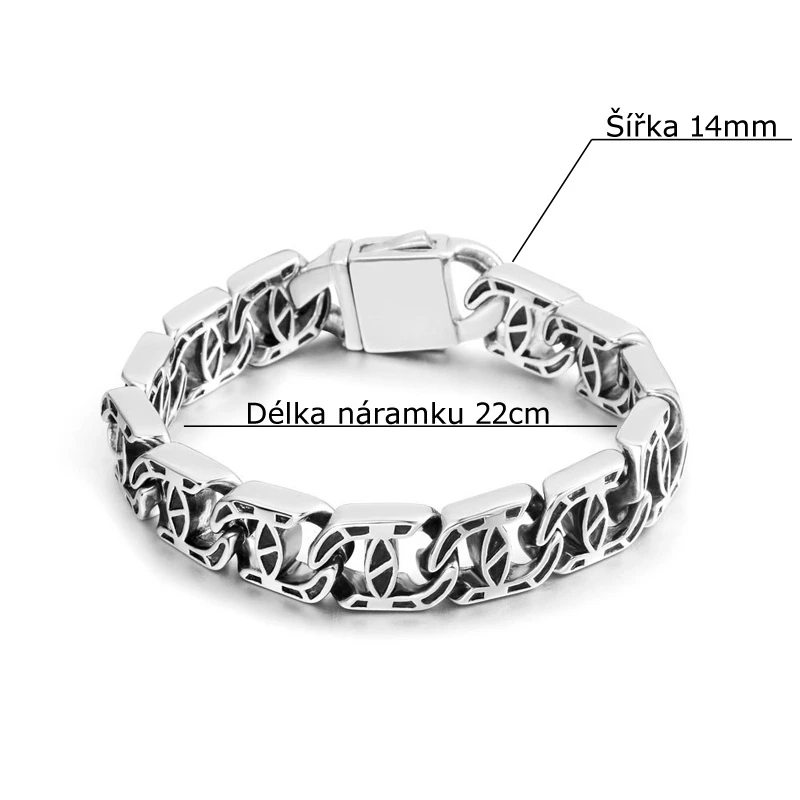 Pánský náramek z chirurgické oceli. Povrch náramku je plastický se vzorem. Délka náramku 22cm, šířka 14mm.