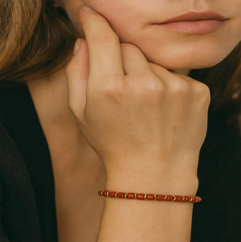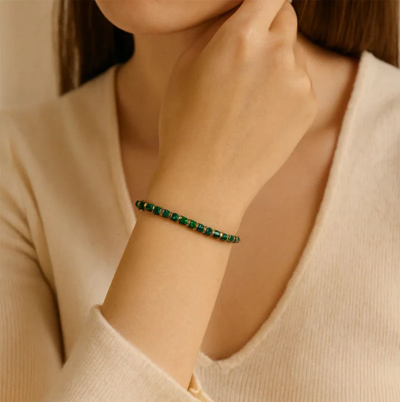 Dámský náramek z chirurgické oceli a umělého malachitu. Části náramku z chirurgické oceli mají povrch pozlacený 14K žlutým zlatem. Náramek má průměr 4 mm. Zapínání náramku je karabinové. Náramek lze zapnout v rozmezí délek 16-20 cm.
