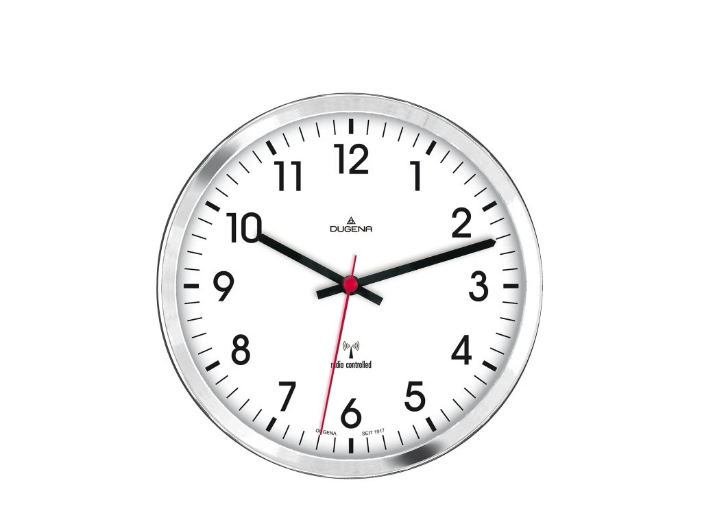Nástěnné hodiny Dugena řízené radiovým signálem, který zajišťuje velmi přesný a zobrazení aktuálního času. Hodiny mají plastové tělo, bílý ciferník s arabskými číslicemi. Průměr těchto nástěnných hodin 305mm. Hodiny jsou napájené baterií, která je součástí balení. Na všechny hodiny a hodinky Dugena je poskytována záruční doba v délce 36 měsíců.