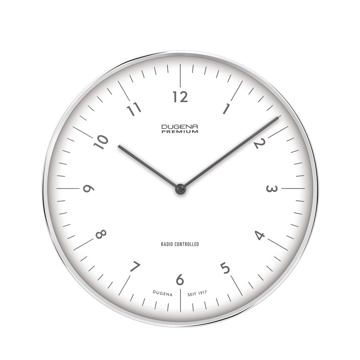 Nástěnné hodiny Dugena řízené radiovým signálem. Hodiny mají kovové tělo, bílý ciferník s arabským číselníkem. Průměr těchto nástěnných hodin 320mm. Hodiny jsou napájené baterií, která je součástí balení. Na všechny hodiny a hodinky Dugena je poskytována záruční doba v délce 36 měsíců.