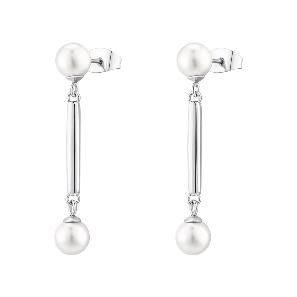 Visací náušnice řady Affinity z chirurgické oceli 316l s leštěným povrchem zdobené umělými perličkami. Náušnicové zapínání je na puzetky. Elegantní perlové náušnice dlouhé 35mm.