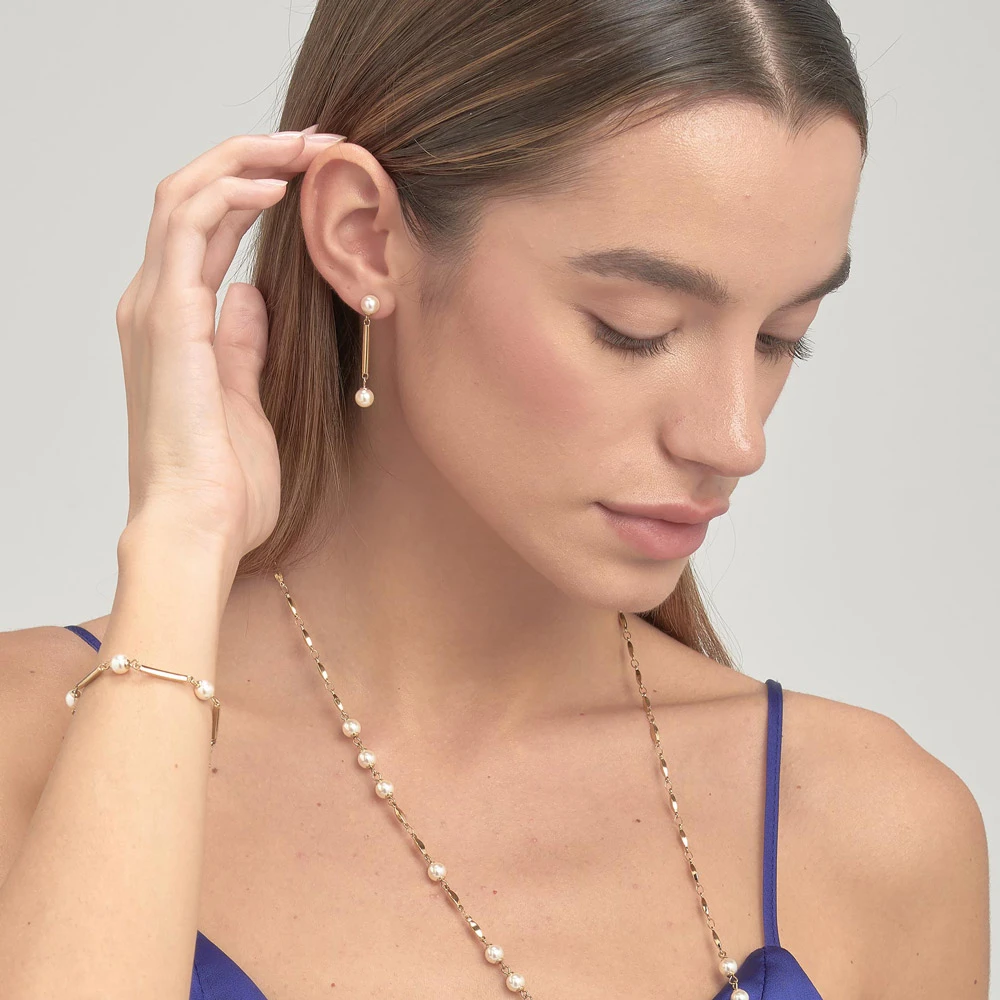 Visací náušnice z chirurgické oceli 316l zdobené umělými perlami. Náušnice mají leštěný povrch pozlacený technologií PVD. Náušnicové zapínání je na puzetky. Elegantní perlové náušnice dlouhé 35mm.