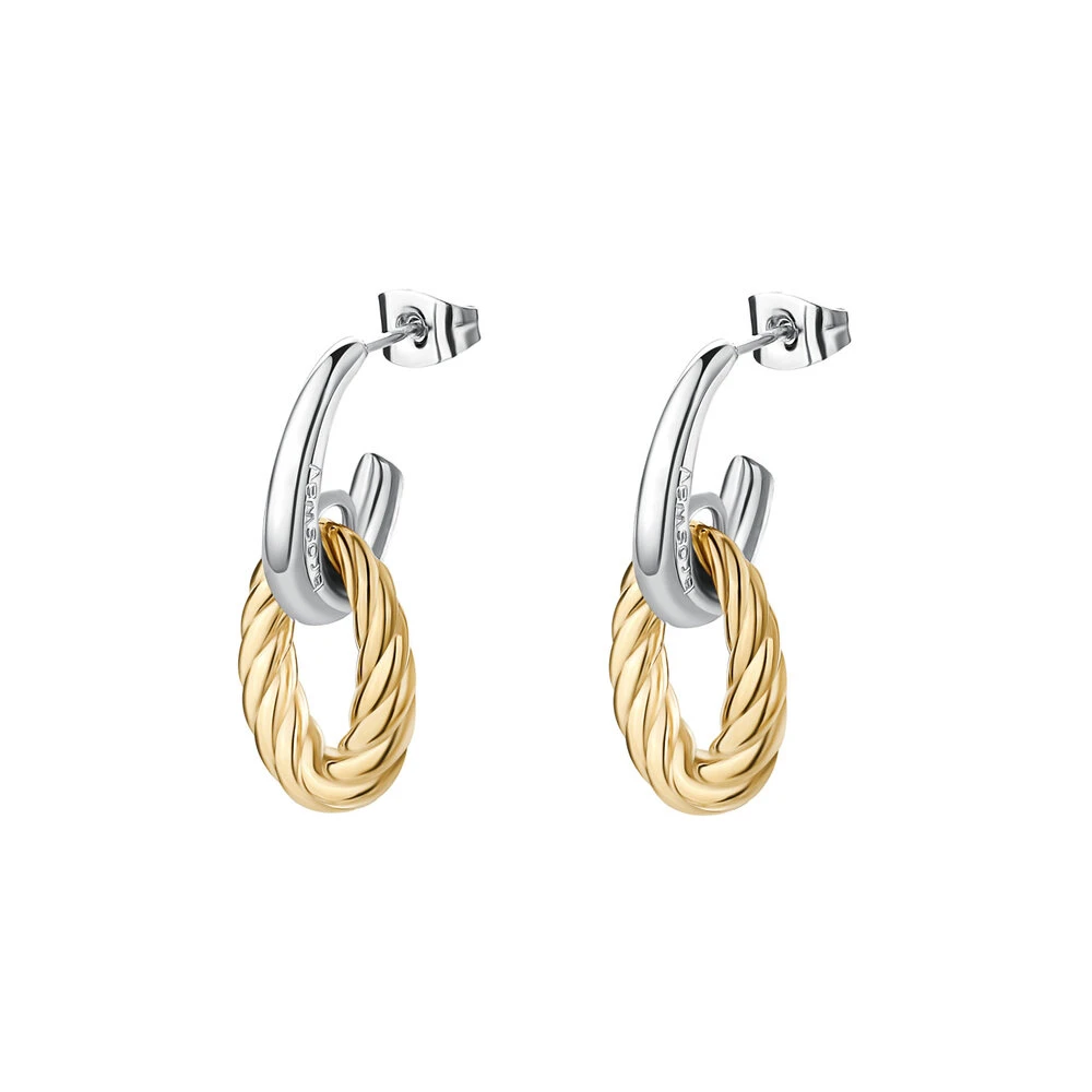 Visací náušnice z chirurgické oceli. Povrch náušnic je leštěný částečně pozlacený technologií PVD. Náušnice jsou dlouhé 27mm. Náušnicové zapínání je na puzetky.