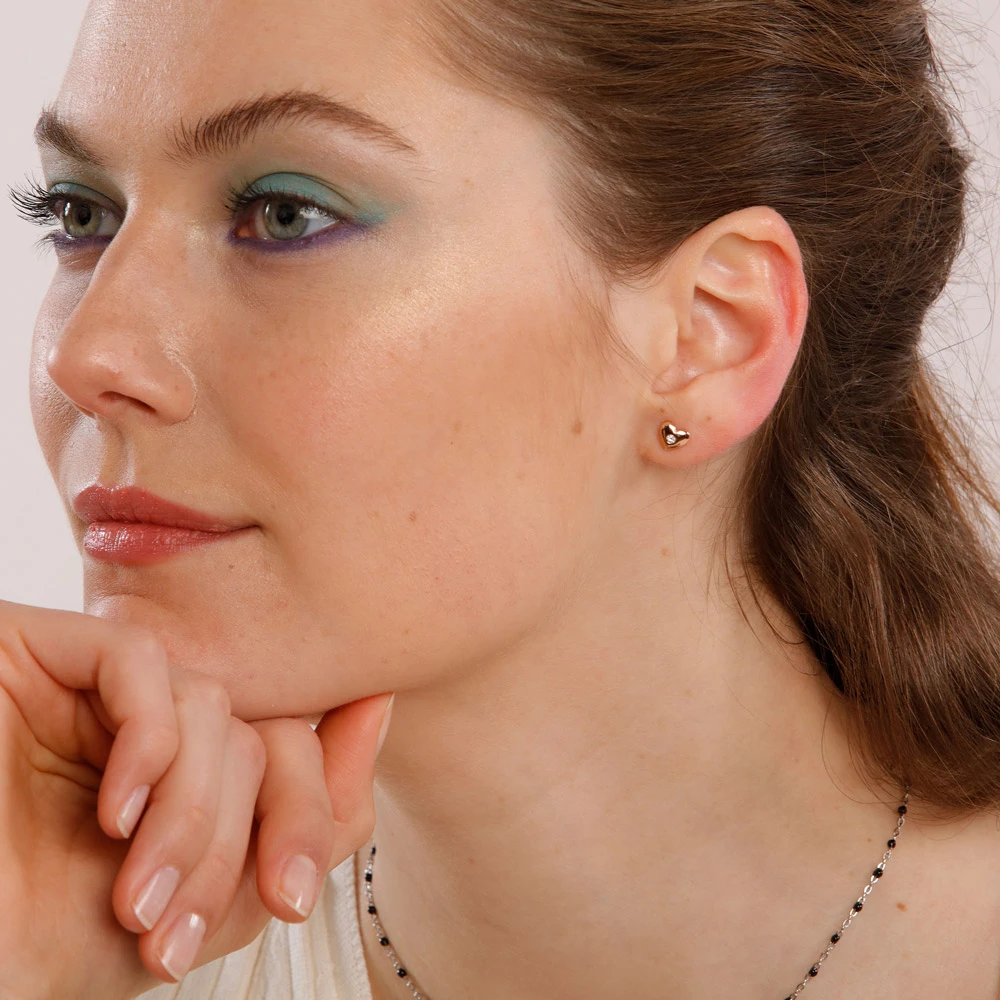 Náušnice pecky ve tvaru srdce z kolekce Chakra jsou vyrobeny z chirurgické oceli 316L. Povrch náušnic je leštěný, upravený technologií PVD v růžové barvě. Pecky zdobí zářivé krystaly. Velikost náušnic 6,3 mm. Náušnicové zapínání je na puzetky.