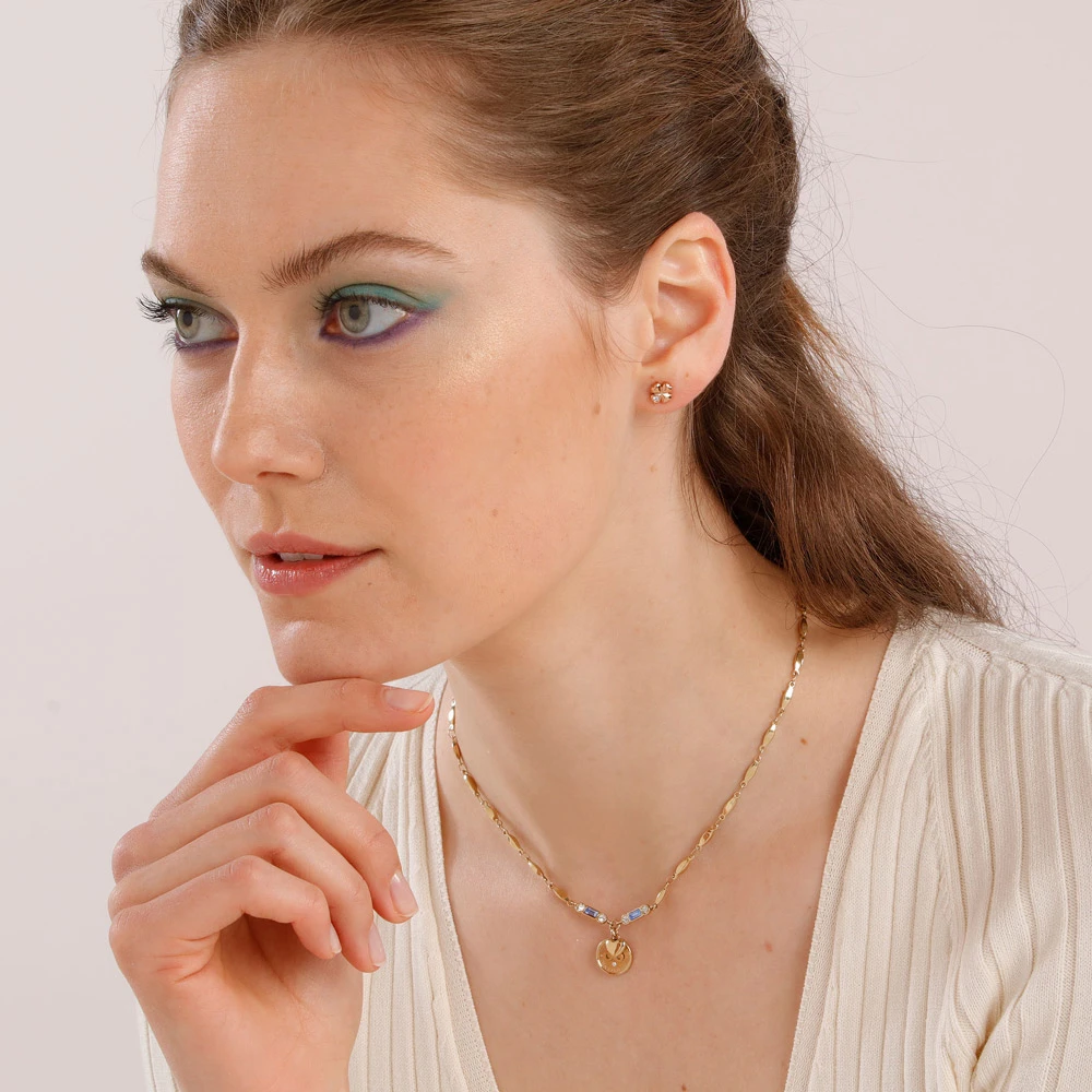 Náušnice pecky ve tvaru čtyřlístků z chirurgické oceli 316L. Povrch náušnic je upravený technologií PVD v růžové barvě. Pecky zdobí zářivé krystaly. Velikost náušnic 6,3 mm. Náušnicové zapínání je na puzetky.