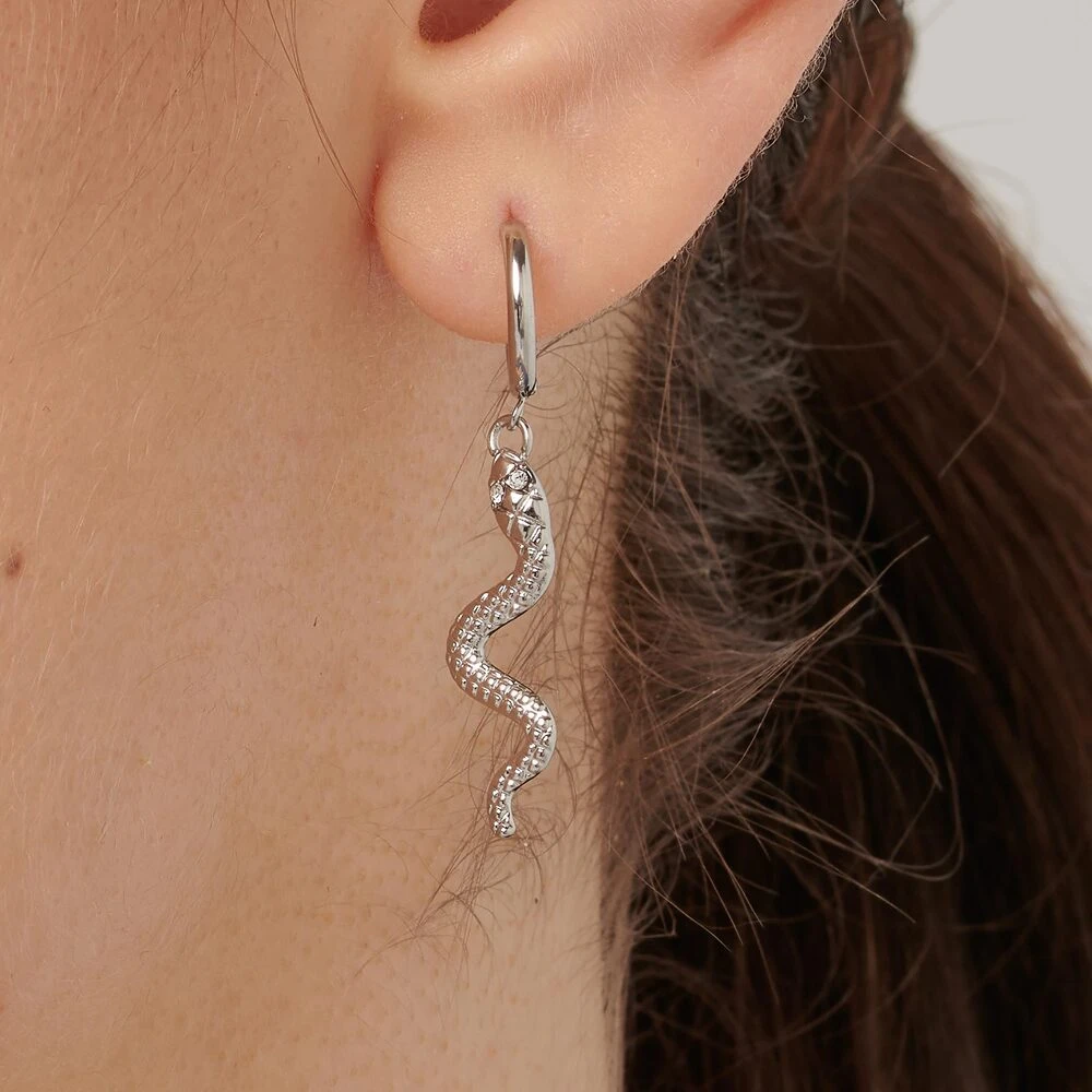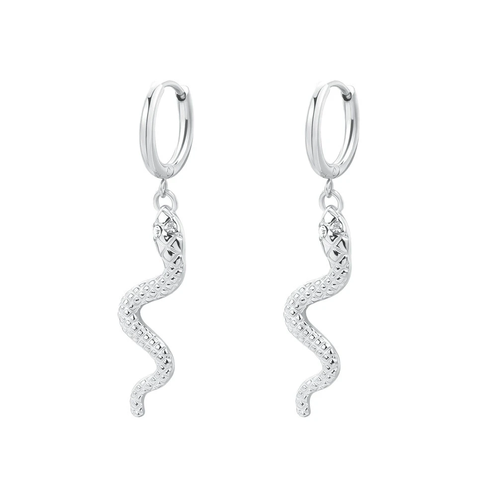 Hadí náušnice visací z chirurgické oceli se zirkony. Povrch náušnic je leštěný se vzorem. Náušnicové zapínání je kloubové. Výška náušnic 36mm.